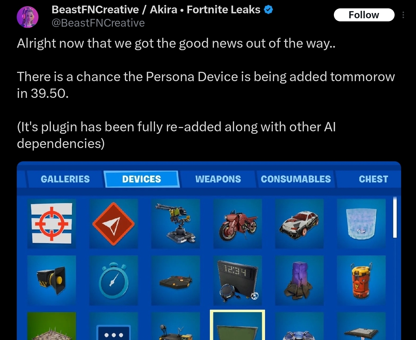 >>557874276>Persona Device, a new feature in UEFN that would allow creators to add generative AI features to their projectsI hate reading this, because I'm afraid one of those maps is gonna use a big chunk of ram and fry my GPU or something because some item is broken