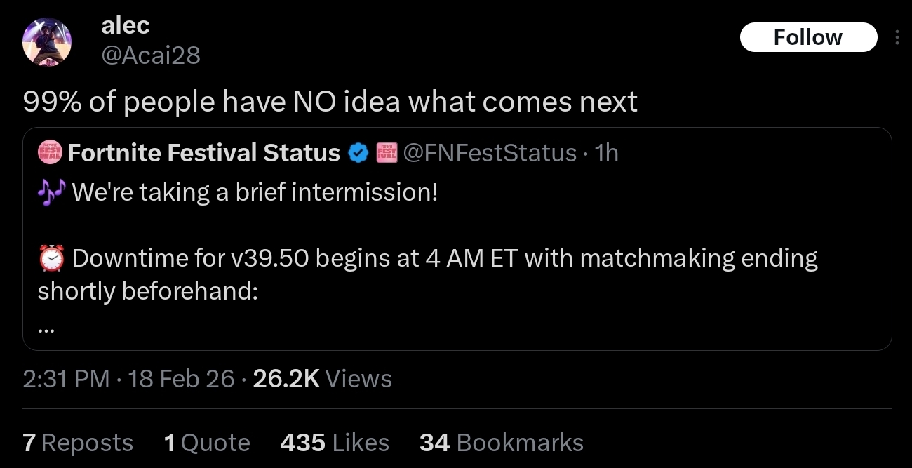 >Fortnite Battle Royale Chapter Seven: Pacific Break | Gameplay Trailerhttps://www.youtube.com/watch?v=Tv2zM8jI4gU >Fortnite Battle Royale Chapter Seven: Pacific Break | Cinematic Trailerhttps://www.youtube.com/watch?v=Eln66CJHna8>Surf To a New Island in Fortnite BR Chapter Seven!https://www.fortnite.com/news/fortnite-battle-royale-chapter-seven-pacific-break-v39-00-update-notes>Fortnite’s Zero Point: The Story So Farhttps://www.youtube.com/watch?v=sfVP0dPJcgo >Quests, stats, shophttps://fortnite.gghttps://fortnite.gg/statshttps://fortnite.gg/shophttps://www.fortnite.com/item-shop>Season XP Leveling Pacehttps://www.fortnitexp.net/>Mission Alerts for StWhttps://freethevbucks.com/timed-missions/https://fortnitedb.com/>Lantern Fest 2026 Brings 8-Player Reload Teams to Fortnitehttps://www.fortnite.com/news/lantern-fest-2026-brings-8-player-reload-teams-to-fortnite>Chappell Roan Rides into Festival for Season 13!https://www.fortnite.com/news/chappell-roan-the-midwest-princess-rides-into-fortnite-festival>Master Your True Potential in LEGO® Fortnite Odyssey’s NINJAGO® Updatehttps://www.fortnite.com/news/master-your-true-potential-in-lego-fortnite-odysseys-ninjago-update>Fortnite Ballistic v37.10 Adds the Veiled Precision SMG, Deployable Wall Gadget, and Morehttps://www.fortnite.com/news/fortnite-ballistic-v37-10-adds-the-veiled-precision-smg-deployable-wall-gadget-and-more>Fortnite Crew February 2026 - Soleilhttps://www.fortnite.com/fortnite-crew-subscriptionPrevious:>>557708989