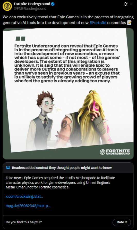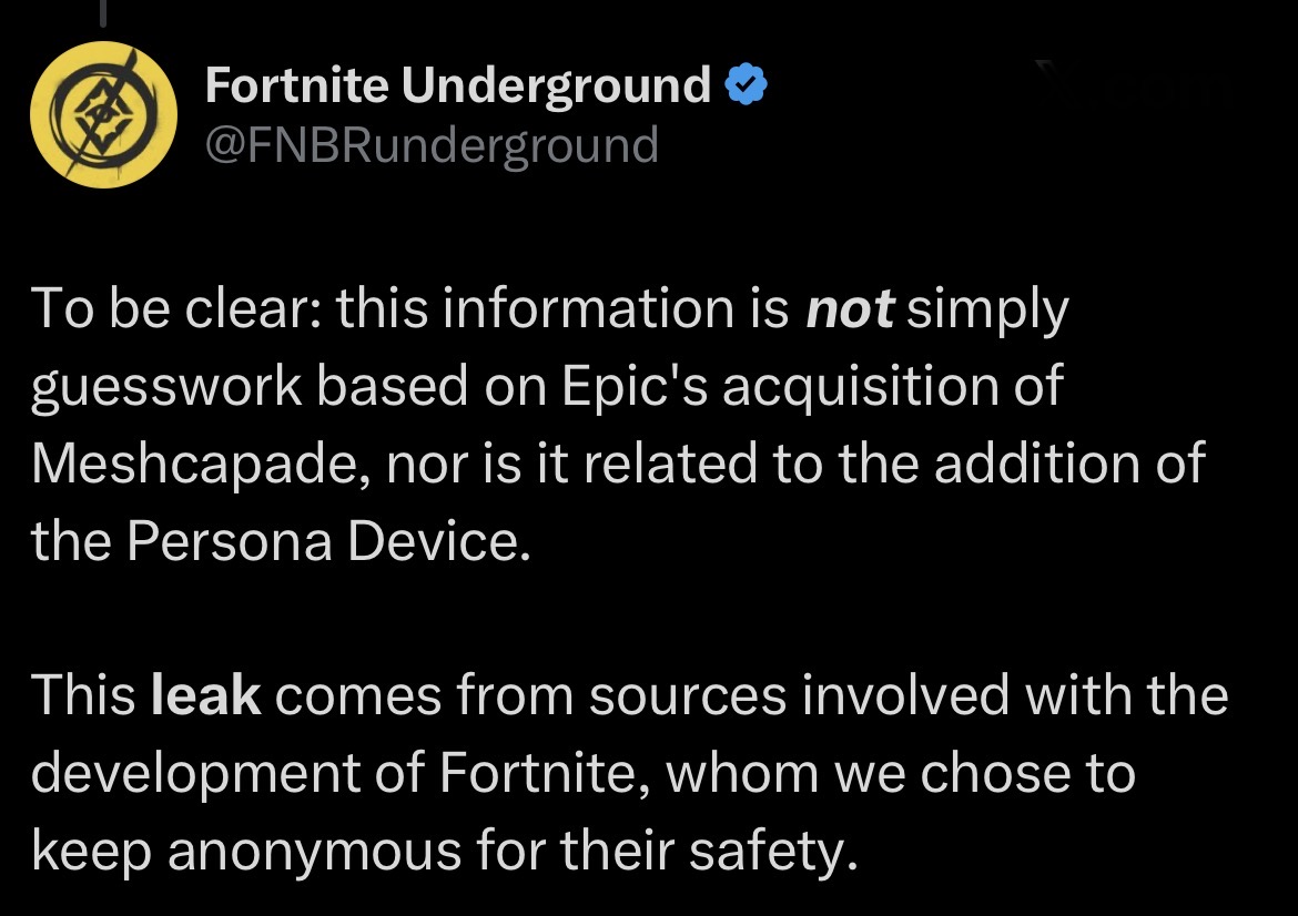 The Fortnite developer announced today that they've acquired Meshcapade, a German startup focusing on using AI technology to assist in animating digital 3D models using real-world camera footage. The acquisition is expected to aid in future Unreal Engine and Metahuman updates, but make no mistake - Epic Games is investigating how they can use generative AI across the entire company.Last year, they launched the Epic Developer Assistant, an AI tool aimed at helping Fortnite developers write code for their projects. They also announced the Persona Device, a new feature in UEFN that would allow creators to add generative AI features to their projects. Leaker BeastFNCreative has indicated that this feature may launch in-game as soon as tomorrow. Fortnite Underground can also reveal that Epic Games is in the process of integrating generative AI tools into the development of new cosmetics, a move which has upset some - if not most - of the games' developers. The extent of this integration is unknown. It is said that this will enable Epic to deliver more Outfits and collaborations to players than we've seen in previous years - an excuse that is unlikely to satisfy the growing crowd of players who feel the game is already adding too many.