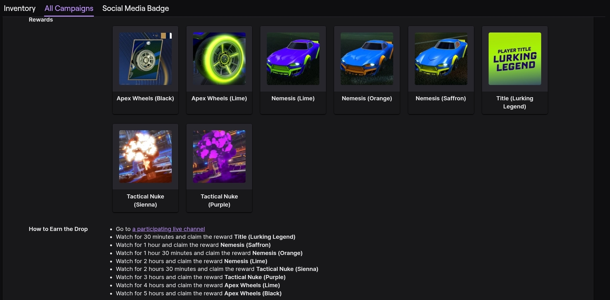 First set of RL twitch drops are live.Last til Sunday the 22ndOf note, none of the items transfer to Fortnite yet.More drops are set to come later on the 22nd.