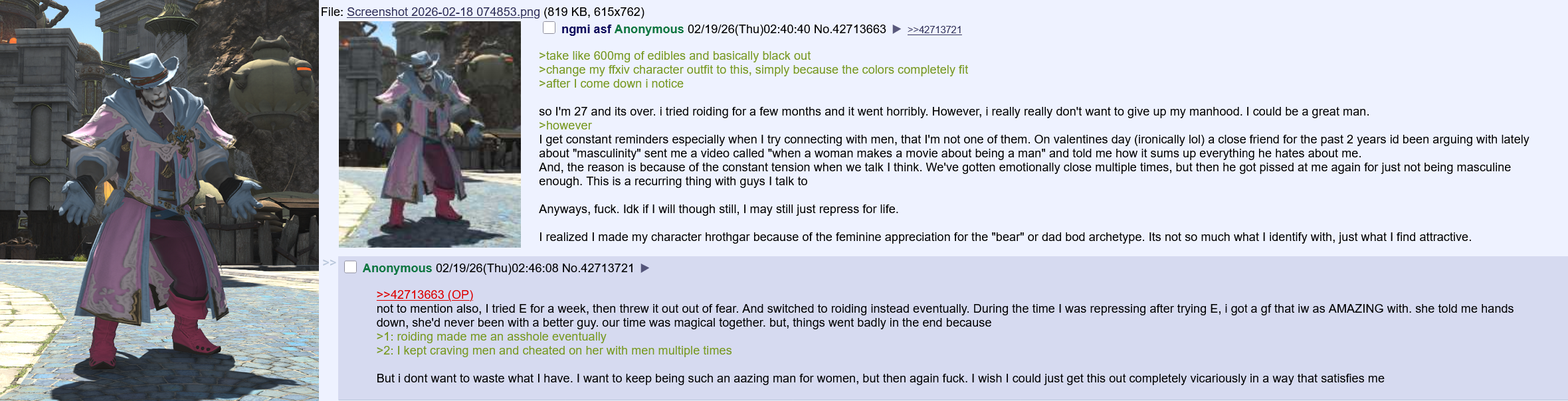 >Patch 7.41 Noteshttps://na.finalfantasyxiv.com/lodestone/topics/detail/fa89e48b03a6bf6deac50a23fdfc39f7df64fb2a>Resourceshttps://rentry.org/xivgresources>Meetups and Events• Feburary 18, 9:00 PM EST | Primal, Famfrit, Lavender Beds W15 P20 | Spooky Club: Angel Beats >>557691731 • February 21, 6:30 PM EST | Materia, Ravana, Empyreum W24 P21 | Male Meetup - The Grand Budapest Hotel & The Phoenician Scheme >>556283751• February 22, 2:00 PM GMT | Alpha, Light, Wolves Den | EU Frontline meetup >>557503549 Previously:>>557868202