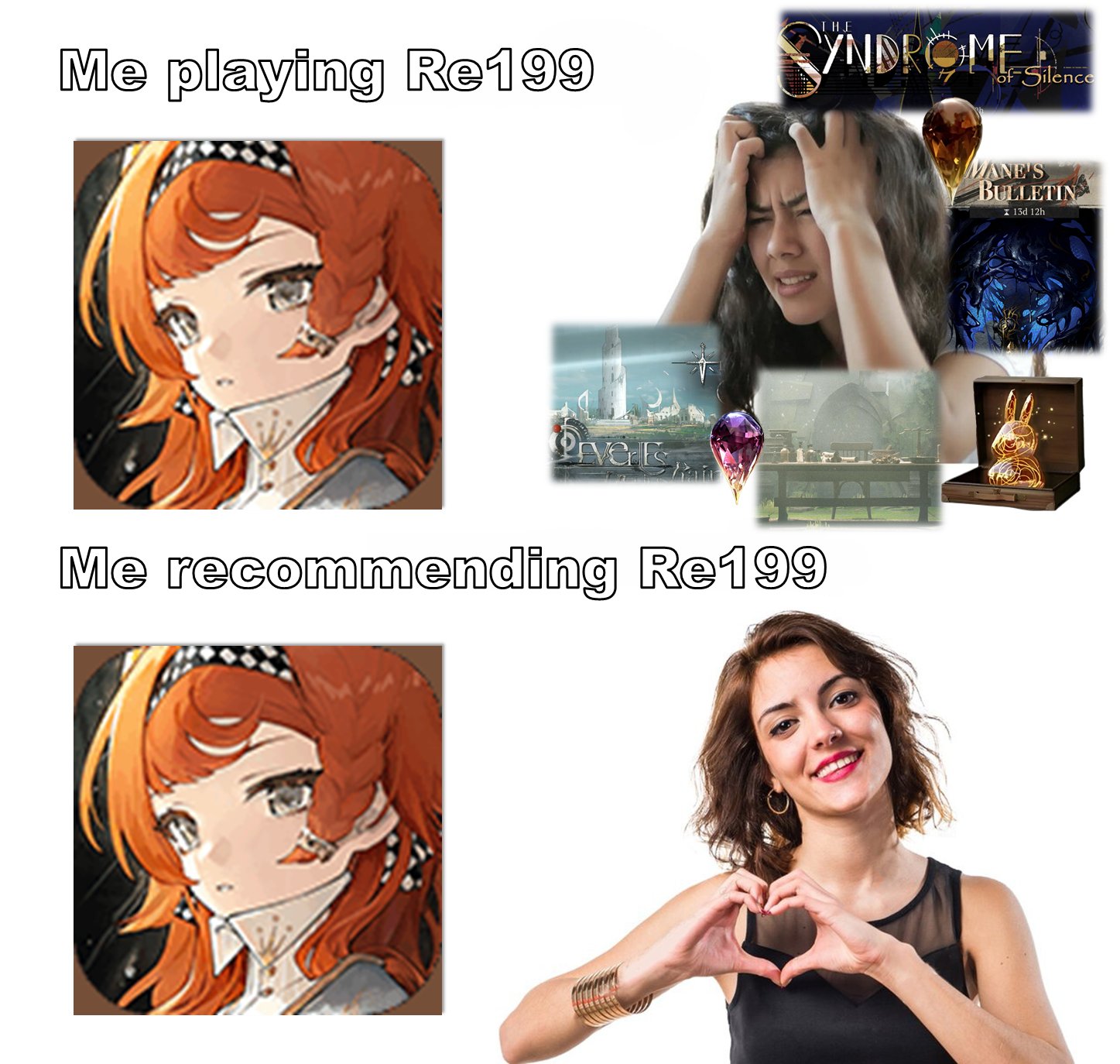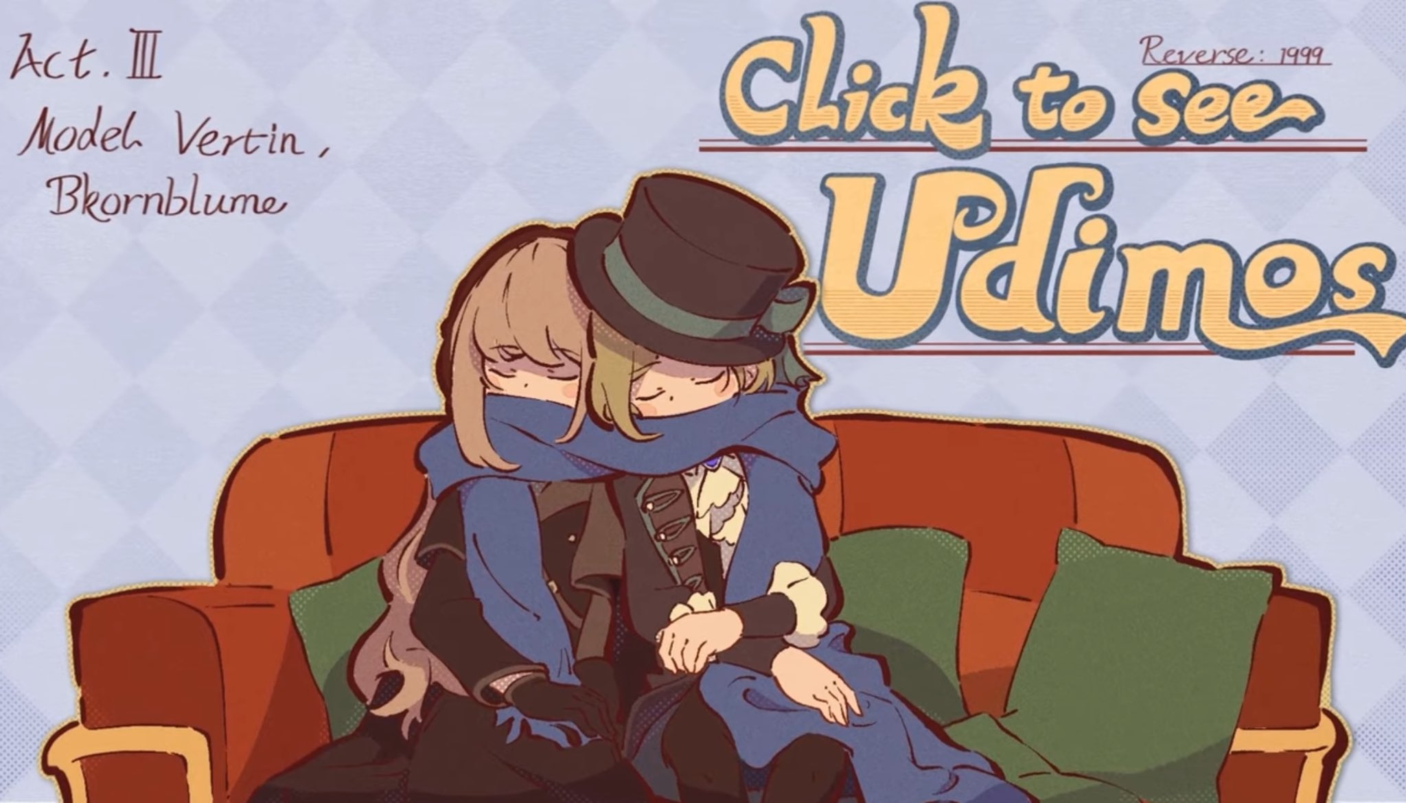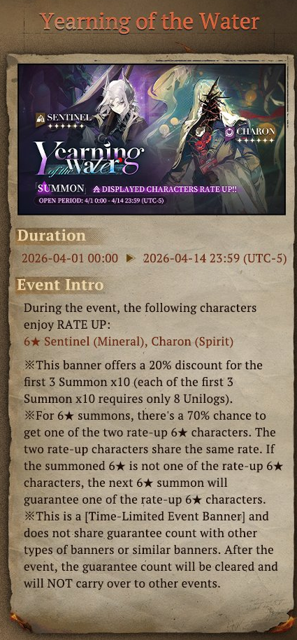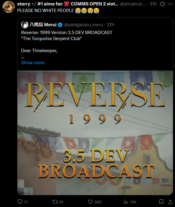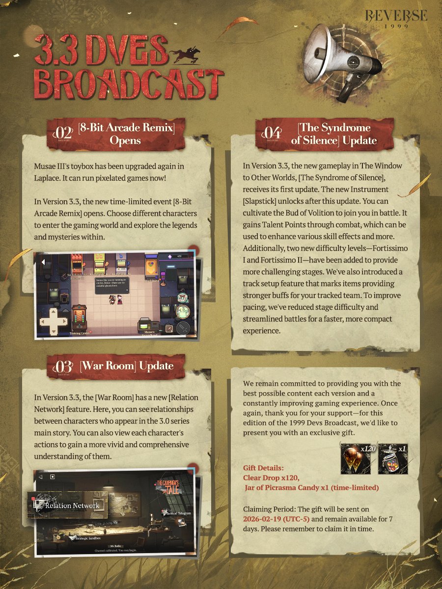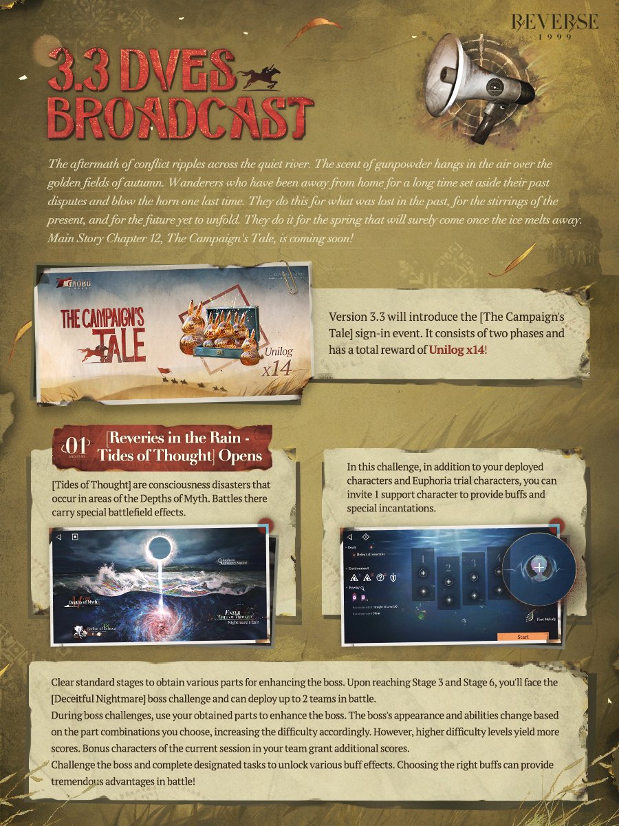 Previous Era: >>557630851>General InfoReverse: 1999 is a turn-based RPG gacha with gameplay revolving around the use of spell cards. The game focuses on storytelling, with a rich main story mode and frequent side story events. The game is fully voiced in 4 languages, with English as the primary one. There are no PvP elements, so you can play at your own pace.Daily rest is at 5AM UTC-5GL 3.2 - http://youtu.be/mQny_eSdF-0 / http://youtu.be/8qTjHQX2c9ICN 3.3 - http://youtu.be/AOhLt363y70CN 3.4 - http://youtu.be/6YUjTpMpfxAends 03/02 | A FLOWING FEAST>Current Contentends 02/20 | 3x Rewards: The Poussiere / Mintage Aestheticsends 03/05 | Beryl - The Long Rain of Fateends 03/05 | The Fool King's Parade (Growth Missions)ends 03/05 | Greetings from the Suitcaseends 03/05 | Mane's Bulletinends 03/05 | Brume - An Unheated Gemends 03/05 | Critter Crash - Rimet Cup: Sticker Editionends 05/28 | The Syndrome of Silence>Upcoming Content02/26 - 03/05 | The Steppe Before the Flames (3.3 Teaser)>Current Bannersends 02/24 | ⟳ | Tooth Fairy (Start Support)ends 03/05 | ◷ | Beryl (Intellect DPS) http://youtu.be/VipED7oWuEU - http://youtu.be/Nl6W4BAw6MIends 03/05 | ※ | Brume (Beast DPS) http://youtu.be/iTTIpkdNoSc - http://youtu.be/X-oYuVBsyzoends 03/05 | ◈ | Euphoria Rate-Up 1x100%: Argus, Ezra, Isolde, Kaala Baunaa, Marcus, Vila>Upcoming Banners02/24 - 03/10 | ⟳ | Ulrich (Intellect Support)>[ Download ] http://re1999.bluepoch.com | http://store.steampowered.com/app/3092660>[ Resources ] http://rentry.org/1999-resources>[ Merchandise ] http://reverse1999.store>Codes1999GIFT, 5YRBRF9, GachaGaming1999, CarnivalFeast, AsPredicted, DreamInverted, UnfatedHand, ShimmeringNight, TrueSpark, QuenchedWill