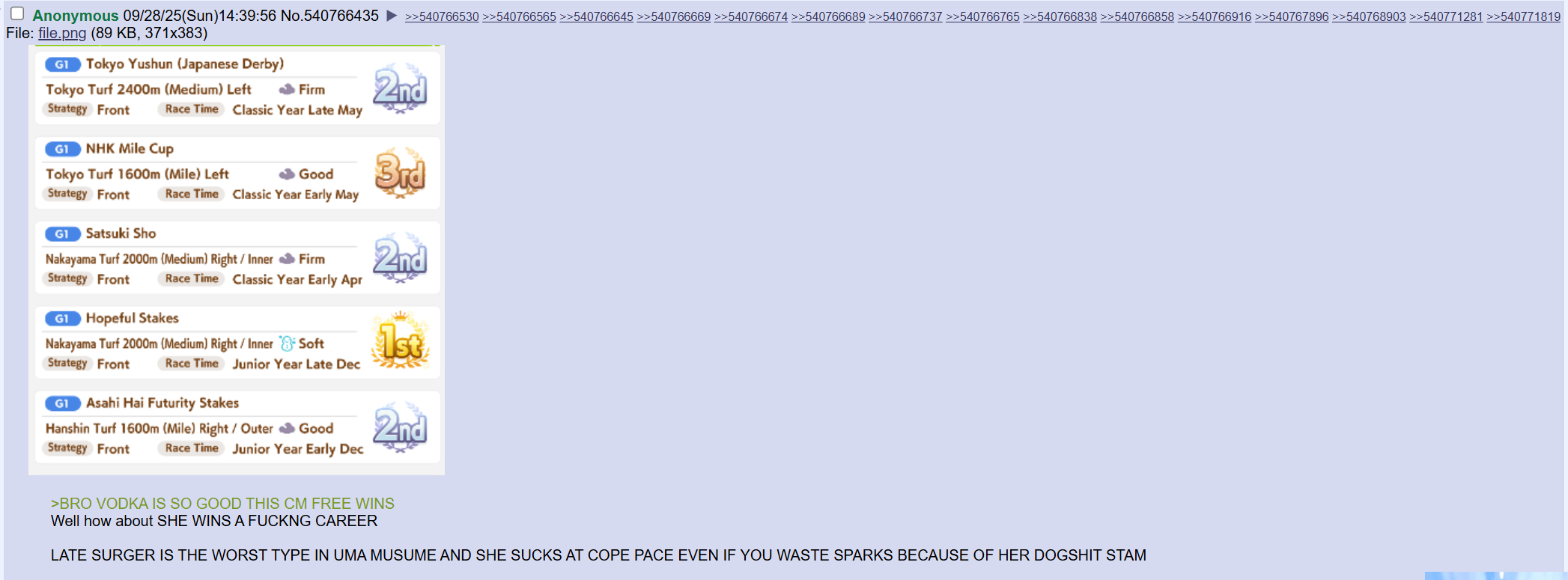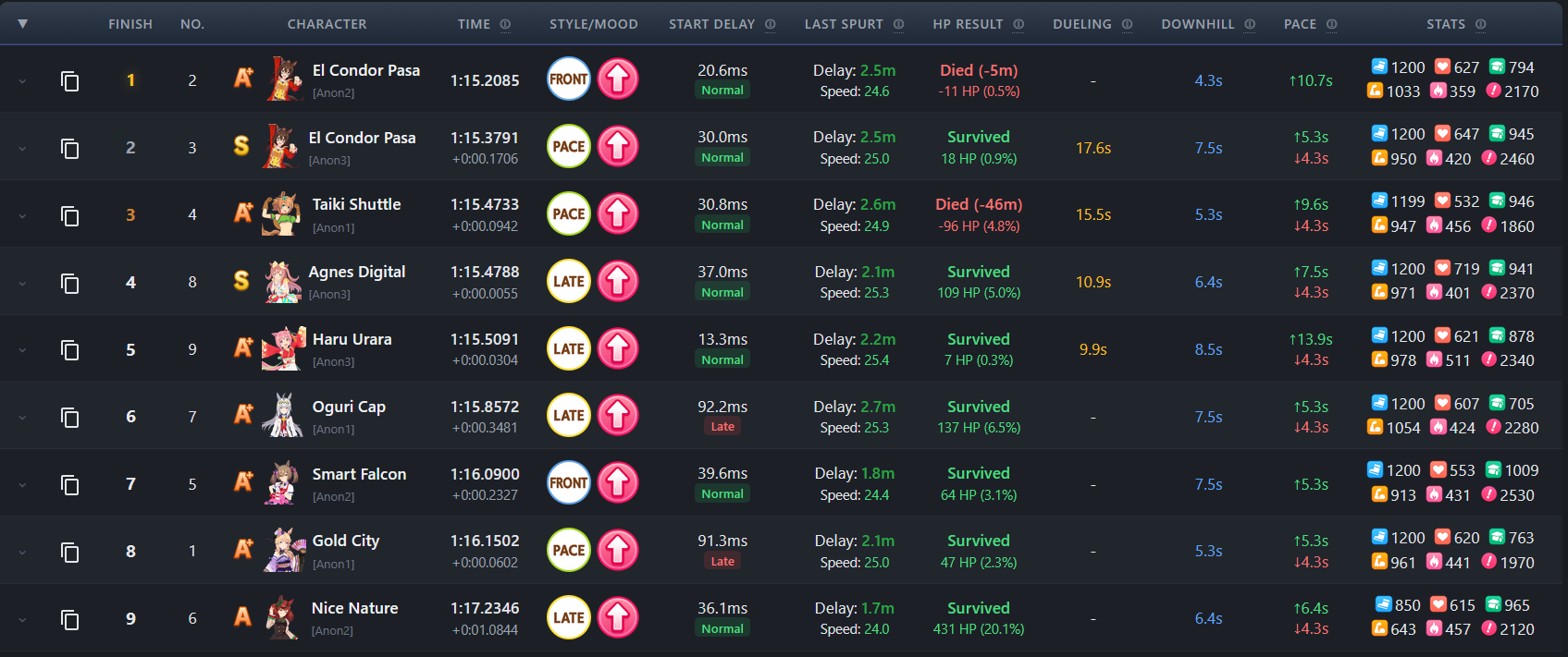 >>557896678CM Results from LE BEEG Umatuberhttps://www.twitch.tv/rednu23Btw don't forget to visit uma.guideAnd look up for future JP Umas like Stego