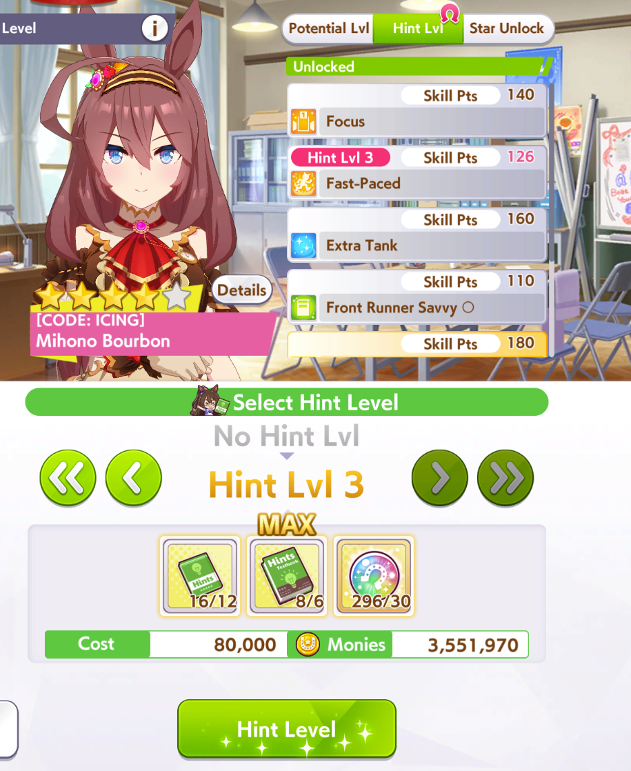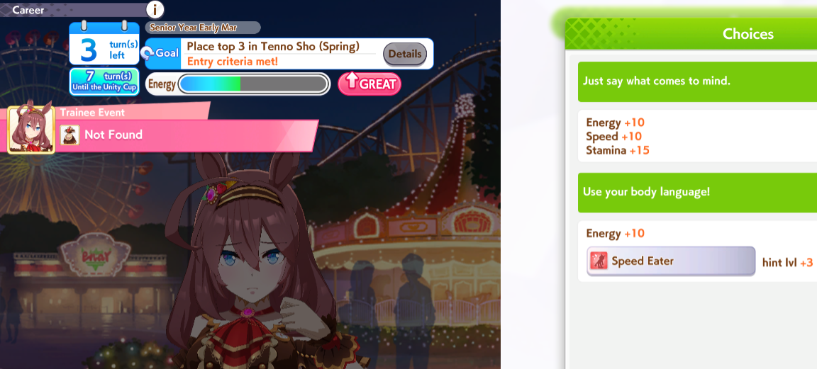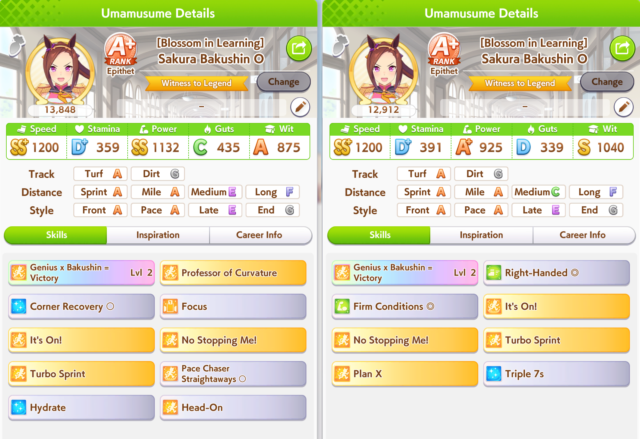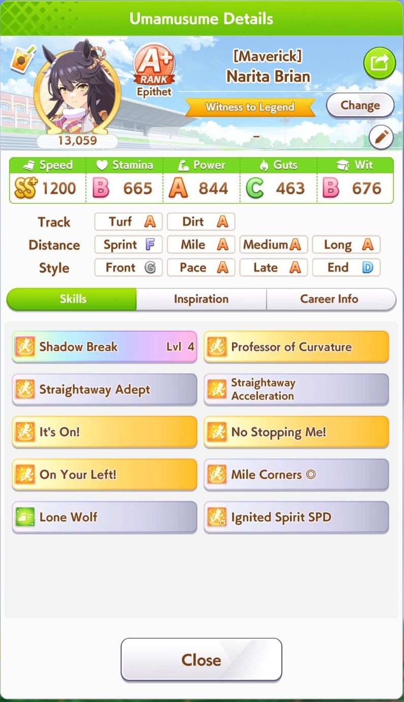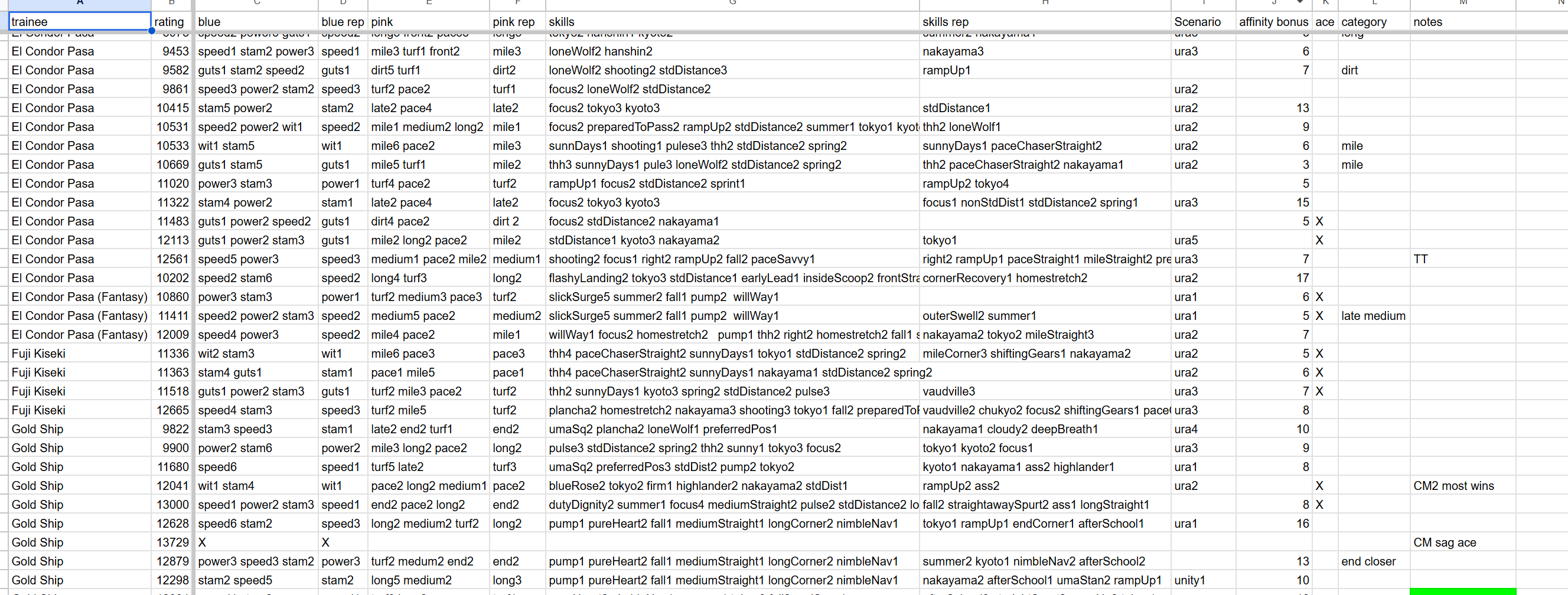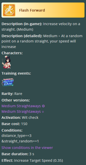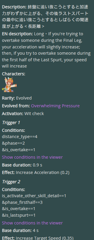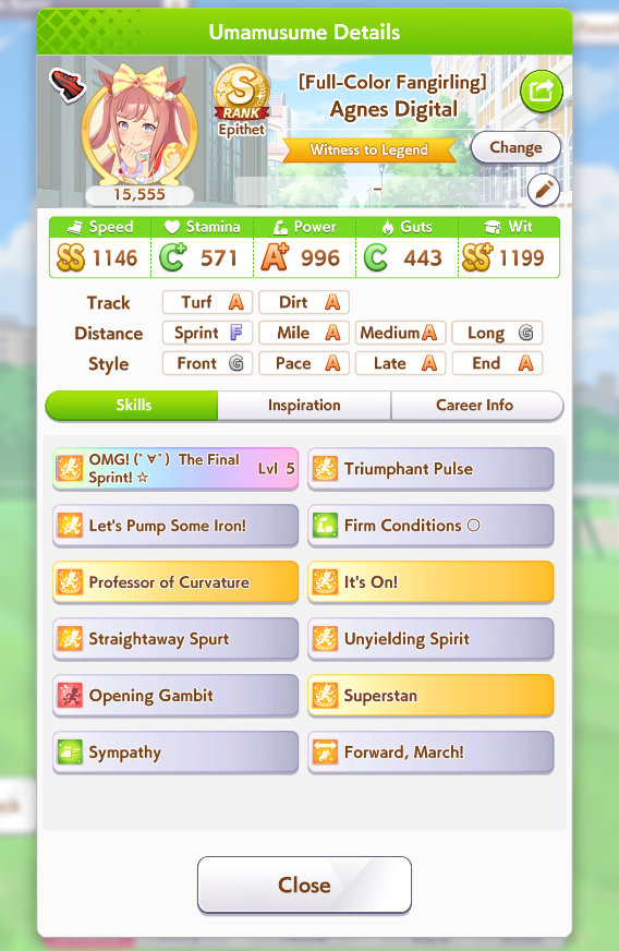 >>557912853greens are bad because>TT track conditions are kinda random so they might not even activate>double circle is bad investment of skill points>They give low points on activationWit give you better position checks among other minor things, which lets you get bonus points during a certain part of the race if you were able to fight for the top position of certain styles. That's why the best TT teams run 3 different positionsWit also increases your skill activation. It feels small at higher values, sure, but it's much better when you look at whiff chance reduction instead of activation chance increase. And activating all your skills in TT is good, yeah