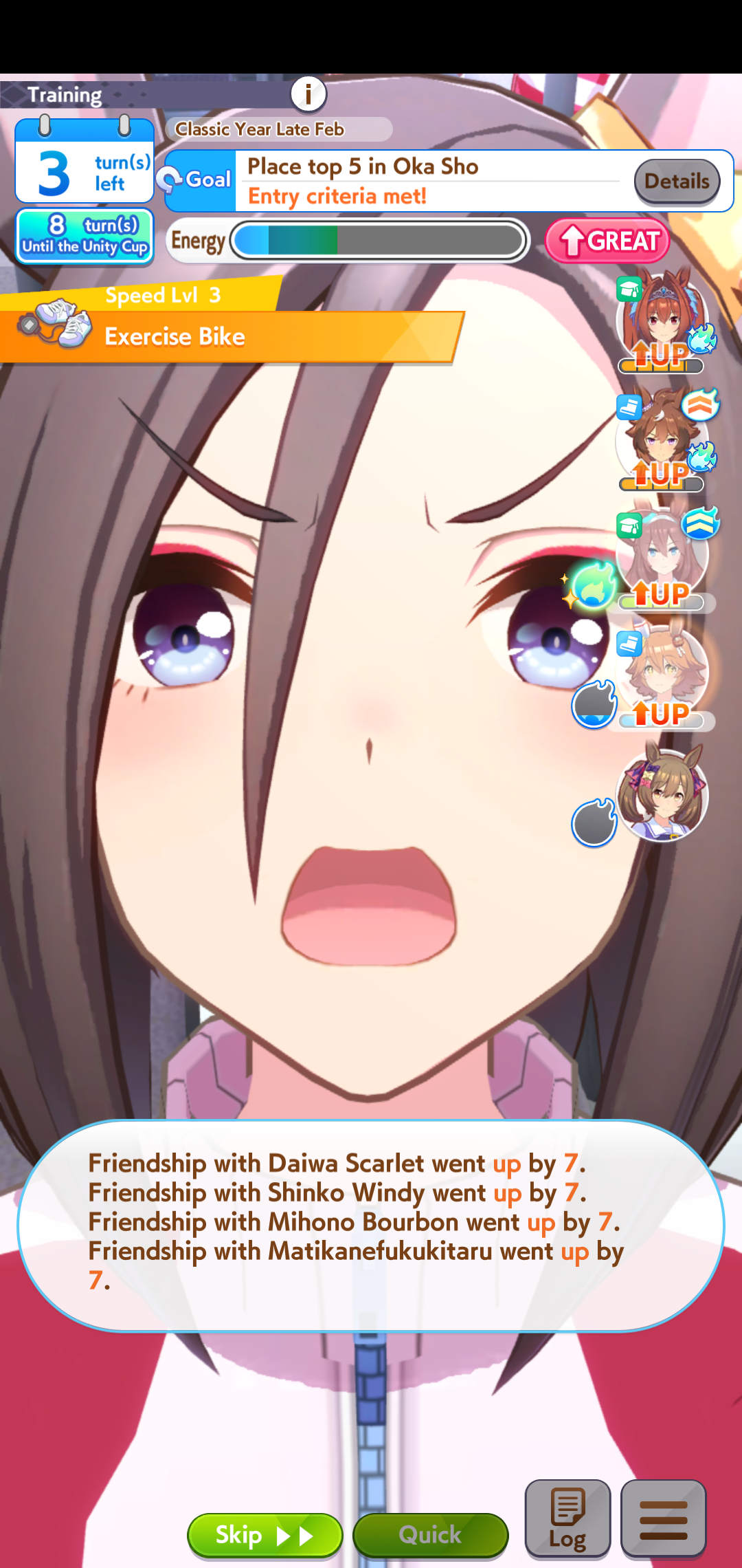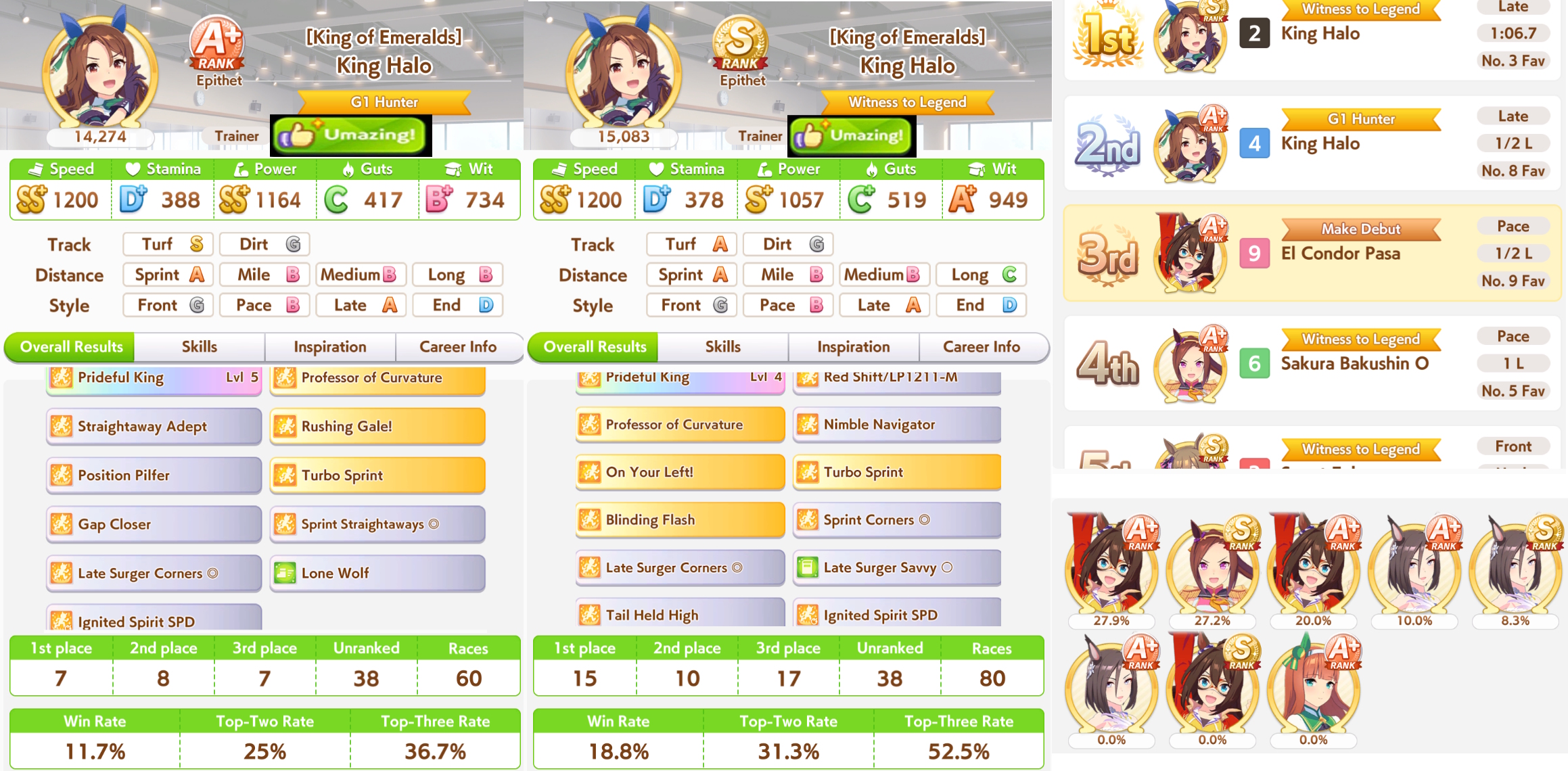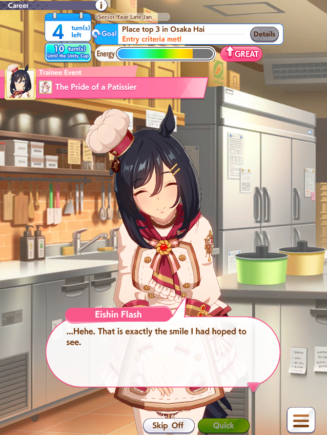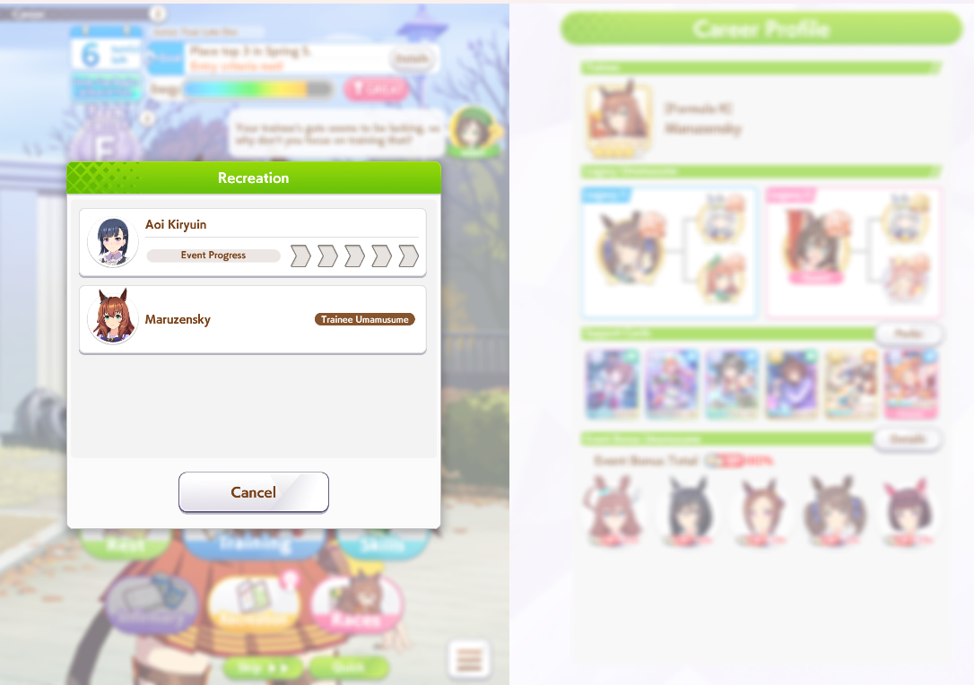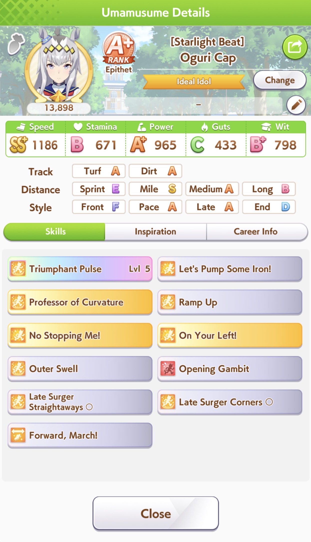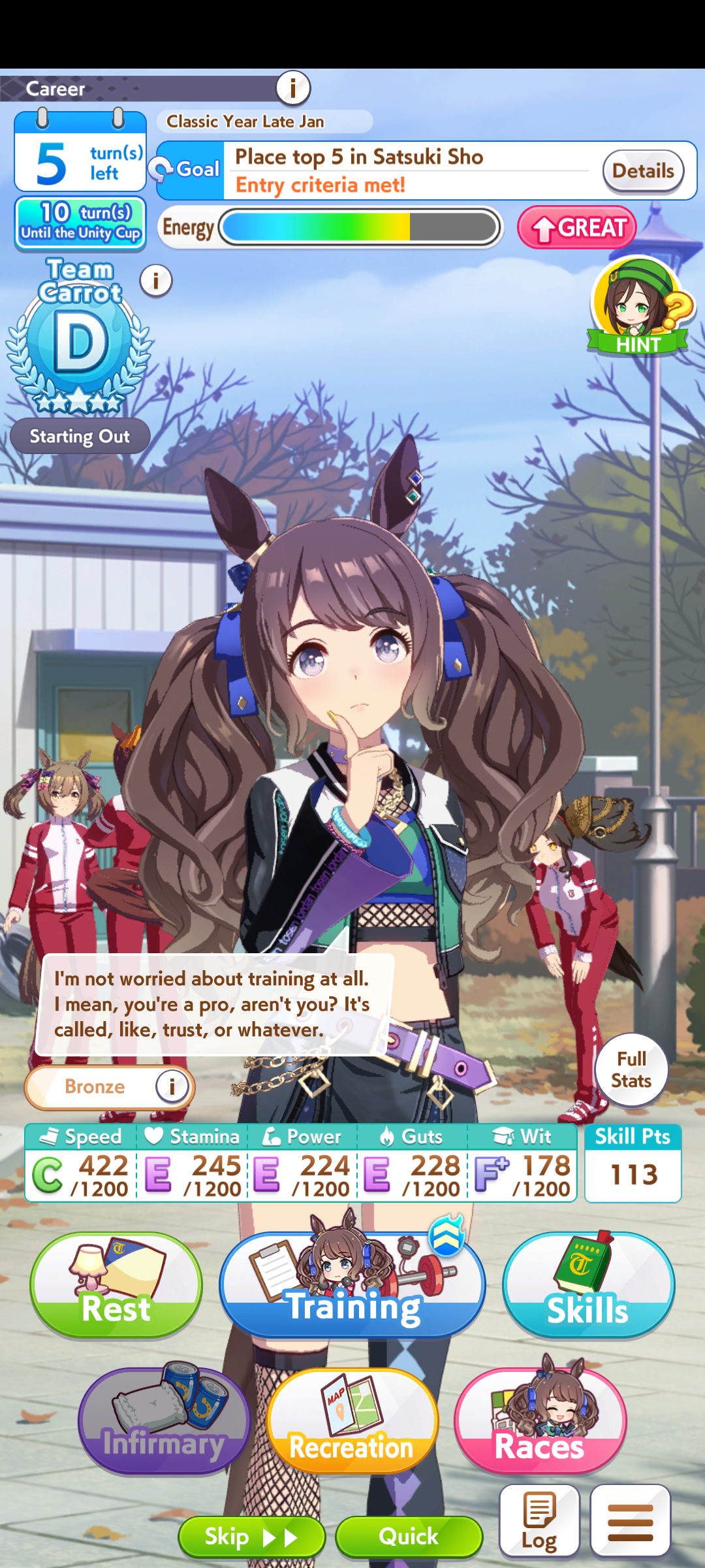 >>557912853greens are bad because>TT track conditions are kinda random so they might not even activate>double circle is bad investment of skill points>They give low points on activationWit give you better position checks among other minor things, which lets you get bonus points during a certain part of the race if you were able to fight for the top position of certain styles. That's why the best TT teams run 3 different positionsWit also increases your skill activation. It feels small at higher values, sure, but it's much better when you look at whiff chance reduction instead of activation chance increase. And activating all your skills in TT is good, yeah