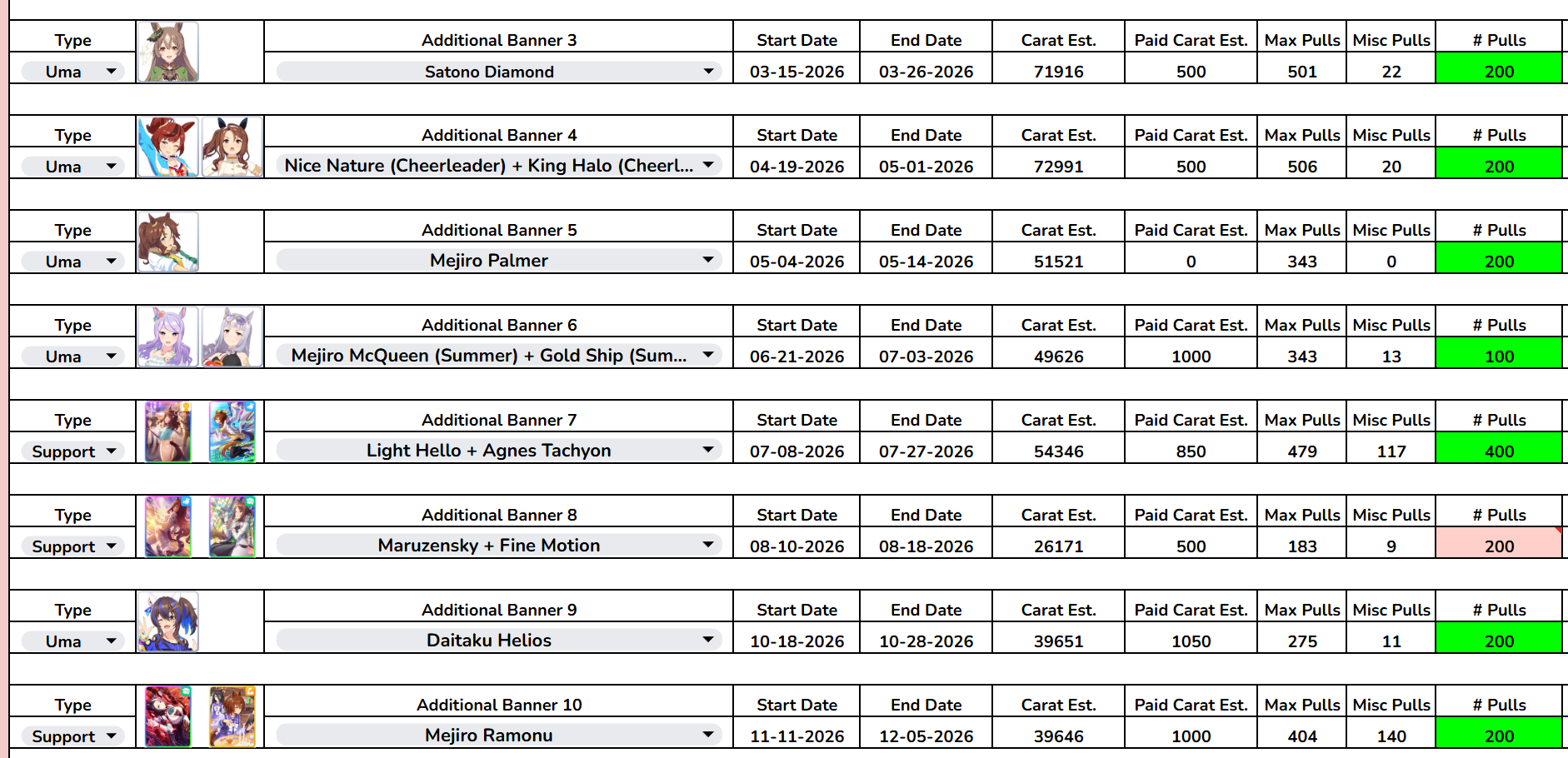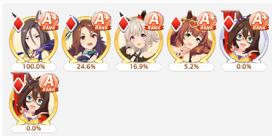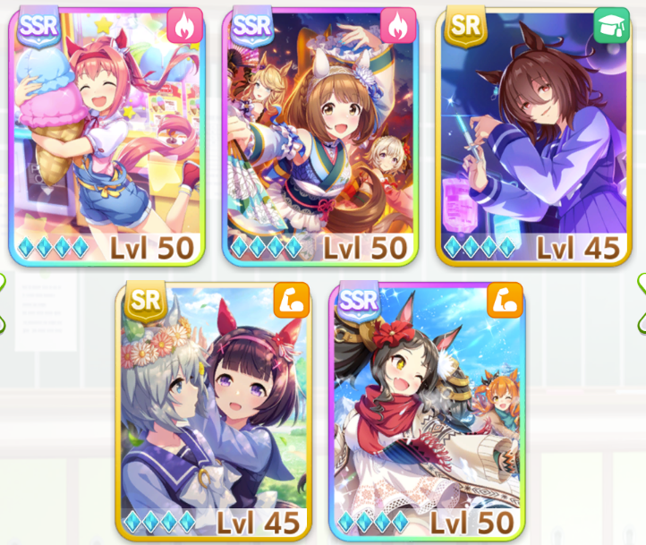 >>557896494I'm 100 pulls or so and only got both valentine with Fuji. The rest is dupes.>>557896971Agemasen based on speed stat is probably alright. You always pump that shit anyway, decent speed specialty to piggyback kitasan too.