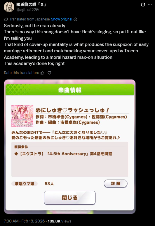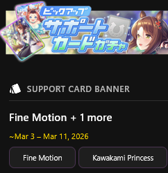 Previous: >>557878724>Global Game NewsLink your account to Cygames iDCurrent Scenario: Aoharu Hai aka "Unity Cup"Current Rate Up Trainee: Mihono Bourbon (3* alt), Eishin Flash (3* alt), Sakura Chiyono O (3*)Current Rate Up Support Cards: Nishino Flower (Wit), Sakura Bakushin O (Guts), SSR Riko Kashimoto (Pal), SSR Tazuna Hayakawa (Pal)Current CM: Capricorn Cup - Chukyo Turf 1200mMain Story Chapter 5 is out02/13 - 02/19 - Capricorn Cup - Chukyo Turf 1200mhttps://umamusume.com/news/100040/https://pages.snep.pw/uma/anni-skill-changes/>JP Game NewsCurrent Rate Up: Valentine Taiki Shuttle (3*), Valentine Sounds of Earth (3*), SSR Matikanefukukitaru, SSR Neo UniverseNew Scenario "Yukoma Hot Spring" releasedTimeline: https://uma.moe/timelineCygames Webstore: https://webstore.cygames.com/en/umamusume_en/>Thread Clubshttps://rentry.co/umaglobalclublistYou must be E3 (20k points) to join a circle. Apply with /uma/ or /vg/ in your profile or post ID in the thread.>All Guides & Resourceshttps://rentry.org/uma26Game databasehttps://gametora.com/umamusume (Click the gear to switch between JP / global server info)A basic guide for newfagshttps://rentry.org/umaglobalFind networks if your region is blocked from the game or clienthttps://www.umavpn.top/93Seiyuu & Concertshttps://rentry.org/umstUma Texthttps://umareader.idsmile.xyz/