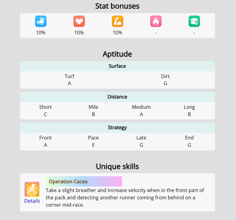 >>557896390It's an okay starter card, it's weak with 20 friendship bonus, but speed bonus and 10 training effectiveness help enough when it hugs the speed facility well enough. Also 35 initial speed and 30 initial power can give a boost leading into Hopeless Stakes, it's not amazing but still on the better side of welfare cards.>BOFA is a decently useful gold skillIt's also another victim of agemasen, be mindful of that.