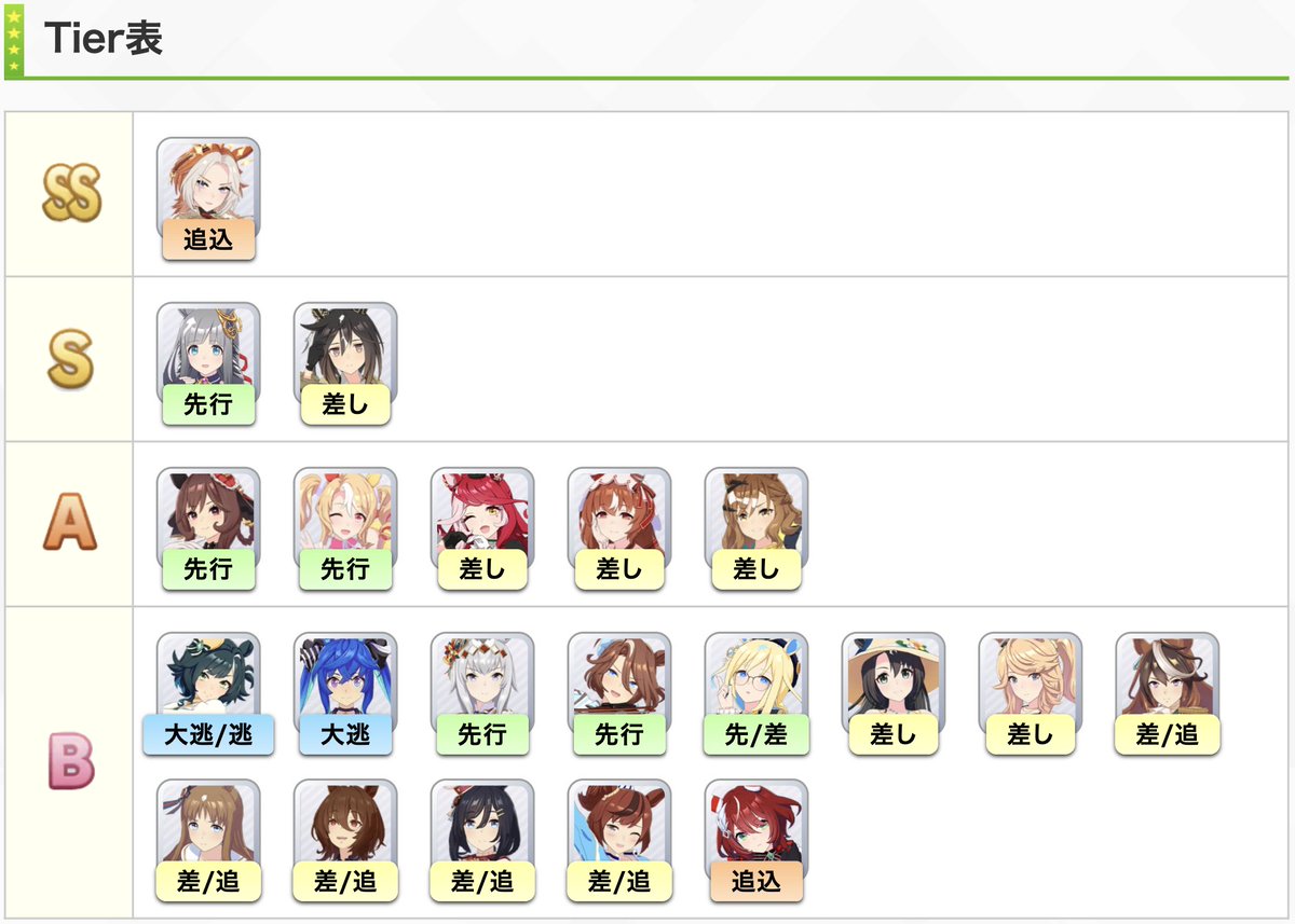 >>557913136>Double circle is badI don't really understand what you mean, are you saying that double circle is already stat superiority so the greens are basically meaningless? >That's why the best TT teams run 3 different positionsI was wondering about this, I'll need to rebuild some of my duplicate style girls then.Right, so steer clear of greens, go harder on wit where you can. Thanks for the tips anon. Then should I be replacing support cards with wit cards?