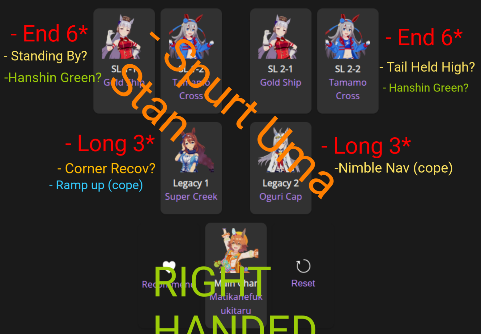 >>557913332>double circle is already stat superiority so the greens are basically meaningless?Kinda. Let's do some quick hypotheticals. You paid 80 skill points for the base right handed for 40 more stat. This is usually fine for CM but still kinda bad for TT. Then you paid another 90 something for the double circle, with the payout only being another 20 speed for 60 total. That's really bad investment because you paid more for half the base effect. You could have just bought another (gold) skill instead because they give the best points per activation, or really good value ones like [distance/style] corner/straights or something.IMO you should add some more wit cards for TT umas, yeah. Just not at the cost of an uma who can actually run the distance you're making them run since that's full witmaxxing territory