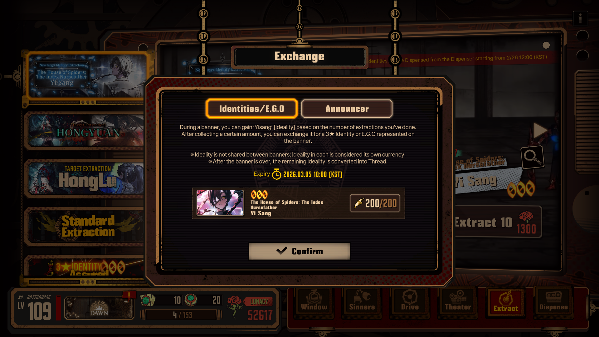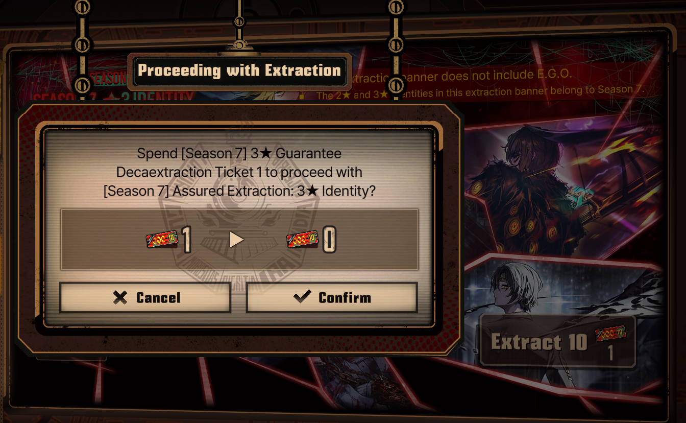 Previous thread: >>557893986Season 7 - Kumo no Ito2025.12.31 —Mirror Dungeon #7 - Mirror of Names and Spiders2026.02.19 —Mirror Dungeon #6 - Mirror of Immortality2025.07.03 — 2026.02.19Refraction Railway Line 5 - Merry Go Round2025.02.20 —>Current Events>Upcoming Extractions2026.02.19 — 2026.03.05[000] The House of Spiders: The Index Nursefather Yi Sang>Current Extractions2026.02.05 — 2026.02.19[000] The House of Spiders: The Pinky Apprentice Sinclair[000] Lobotomy E.G.O::Lamp Gregor2026.02.05 — 2026.02.19Target Extraction: [ Faust ] ID & E.G.O>FAQs! This game is directly tied to the setting of Project Moon's previous games, Lobotomy Corporation and Library of Ruina, and is set after both. Expect spoilers for those games in this thread.! The tutorial is important.>Download linksAppStore: https://apps.apple.com/app/limbus-company/id6444112366Google Play: https://play.google.com/store/apps/details?id=com.ProjectMoon.LimbusCompanySteam: https://store.steampowered.com/app/1973530/Limbus_Company/>Other linksOfficial twitter: https://twitter.com/limbuscompany_bOfficial youtube: https://www.youtube.com/@ProjectMoonOfficialOfficial site: https://limbuscompany.global>Required readinghttps://mega.nz/folder/xosDkZ5Z#Wt4JpUt5Bb2XG77pxuuXpw>For all your EGO and Sinner info needshttps://limbus.kusoge.xyz/https://gll-fun.com/en/>Useful resources and a general guidehttps://rentry.org/lcg_resourceshttps://rentry.org/lcbguidehttps://rentry.org/LCB_optimal_grind_guidehttps://lcb-days-since-last-id.carrd.co/https://lcb-days-since-last-ego.carrd.co/>Countdownhttps://lcbcountdown.carrd.co/