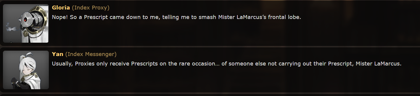 >>557918632People getting Prescripts is the "cost" of living in Index territory and being protected by them, like we learned in Ruina. I think people forget that Index is still a Syndicate just like all of the other fingers.