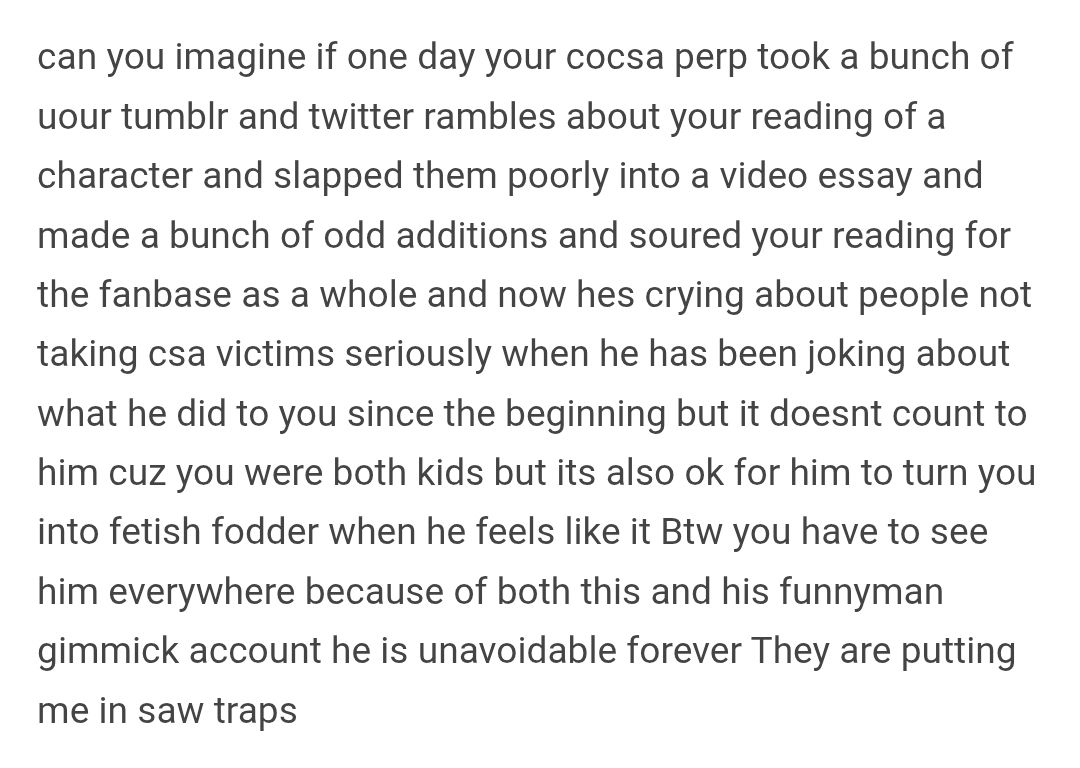 >>557920396>that's just people shitposting, because saying "he has a basement where he keeps future prescript victims" isn't as funny as "rape dungeon"