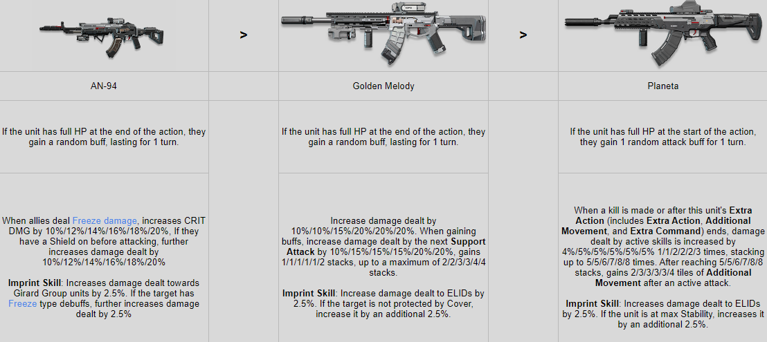 >>557977915Daiyan is viable enough at 0. You can also just rob her key and put it on early units that need the movement.Ullrid is fine at v0 with her two modkeys, but it is suggested to get her sword.Dush was never that great, though the modkey makes her slightly better. Personally I think she should aim for v1 as it makes her ult give Movement Up II for the team.Yoohee is another v1 doll. V0 is fine but consider v1 later if you build Physical.Zhaohui is honestly kinda bad. She does have powerful utility for evacuation/forced relocation maps, but it's locked at v3 and that's a lot of investment. V0 don't even bother. It's a shame because I really like her.Niketta, v1 is ideal but v0 is fine, you'll just have to alternate between skills instead of the easy s2+ult every turn except the first.