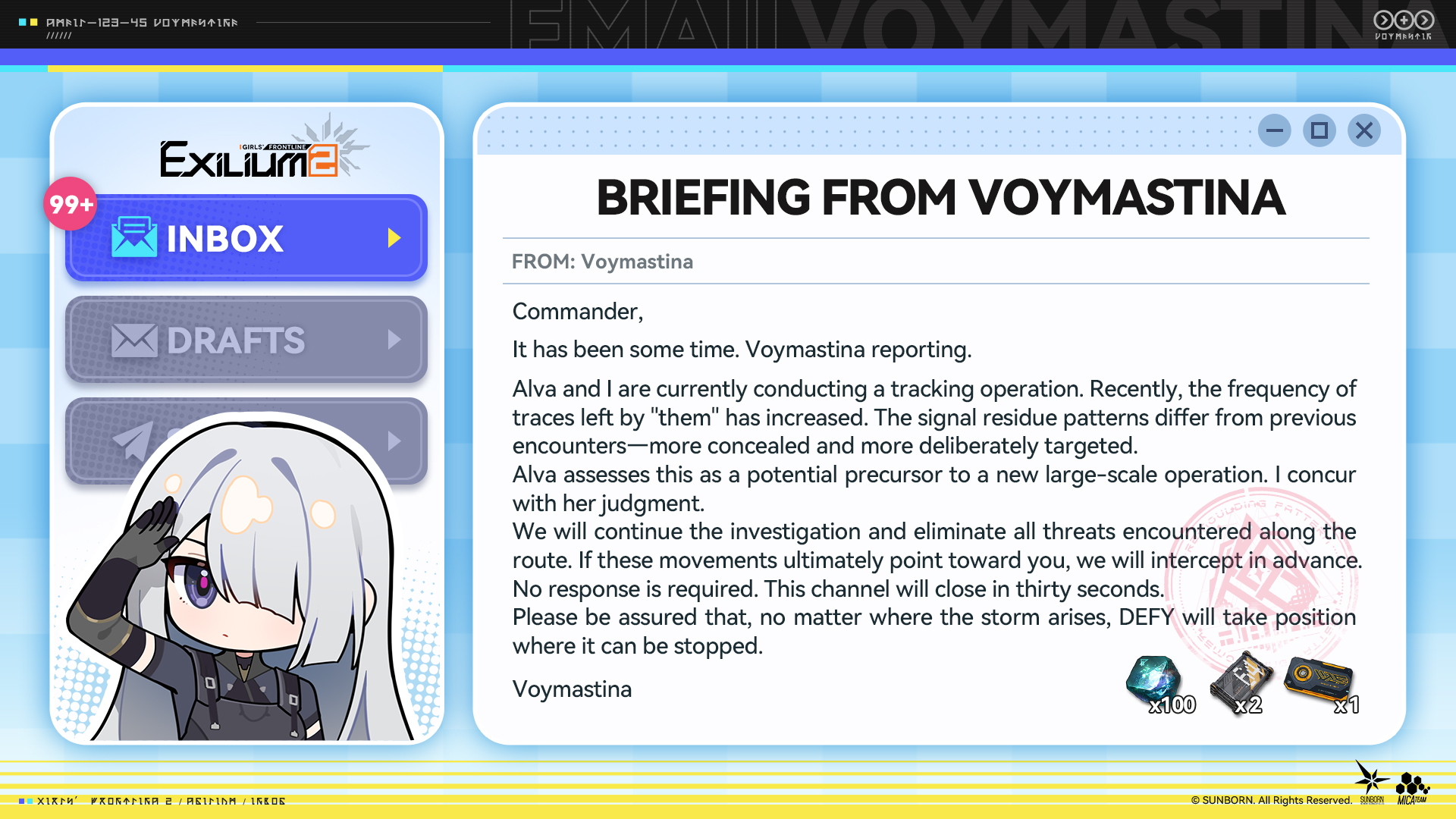 Previous: >>557682953This is a thread for MICA/Sunborn games. Including Girls' Frontline 1 and 2, Neural Cloud and Reverse Collapse: Code Name Bakery.Bind your account to a Sunborn ID instead of logging in from Facebook/Google.>STORY SUMMARYhttps://docs.google.com/document/d/1IalPz5JPc8-we4MiOsYhrMrOINifxW9d9Q6mTAqGoq8>TRANSLATED STORY & LORE MATERIALhttps://drive.google.com/drive/u/0/folders/14bAuWaGbagJwucmlit3EkXFqMRV9NHZO>GUIDESGF1 Resources: https://rentry.org/o9ibbk2kGF2 Resources: https://rentry.co/5x2kxhs4PNC Resources: https://rentry.org/dd5q8b25RC: https://store.steampowered.com/app/1127700/Reverse_Collapse_Code_Name_Bakery/>NEWS/EVENTS (GF1 EN)[Current] Feb. 10 - Feb. 23 | Event rerun: The Summer Garden of Forking Paths>NEWS/EVENTS (GF2 EN)[Current] Feb. 18 - Mar. 12 | Targeted Procurement: Alva[Current] Feb. 18 - Mar. 12 | Corposant - Part 1 + 1.5[Upcoming] Mar. 12 - Apr. 2 | Targeted Procurement: Voymastina[Upcoming] Mar. 12 - Apr. 2 | Corposant - Part 2>NEWS/EVENTS (PNC EN)[Current] Mar. 25 2025 - ? | Nothing>Old Events & OP Templatehttps://rentry.org/gfgroot>DO NOT REDEEMURAB1GD0RC (D) (H)Reminder to bully seaniggers, discord trannies, bugmen, /v/ermins, dramaniggers, tripniggers, tourists, yuritroons, retards & degenerates, and to lurk 2 months before posting