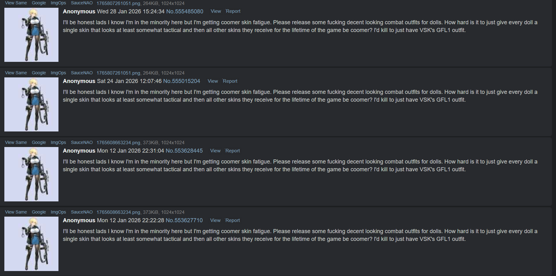 >>557981687As far as I can see there's no unobtainable dolls in the listPick your favorite > Pick an SG because they're expensive > Pick an AR if you want a non-SG doll because their 5* pool is the most polluted>>557981506>retard 1 sees a singular shitposter shitting up the thread and makes it about "you people">retard 2 agrees with his wrong assessment and starts his daily seethePlease attain self-awareness