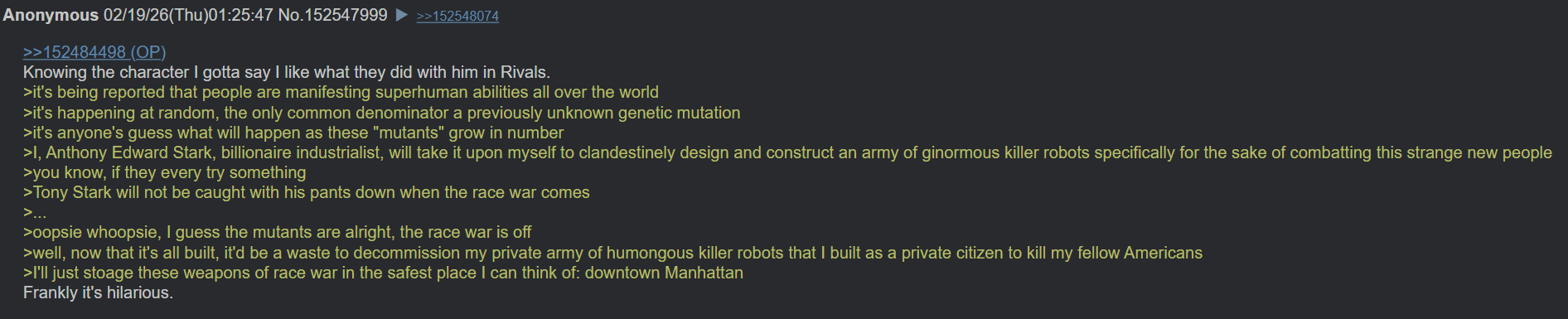 >>557944320>Wolverine>responsibilityThe concept is foreign to him.
