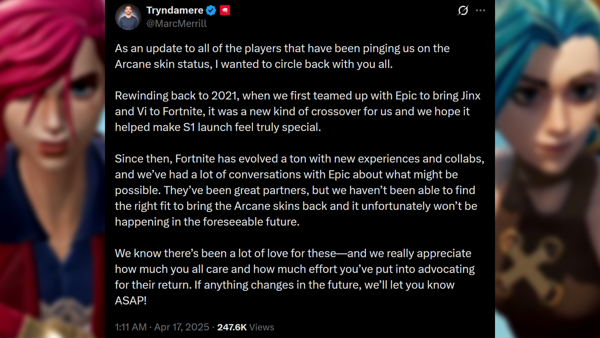 >>557950302Epic got tired of their inboxes blowing up with Arcane shit, so they kicked the ball into Riot's court. From their it was a matter of twitterfags wearing down Marc's willpower.