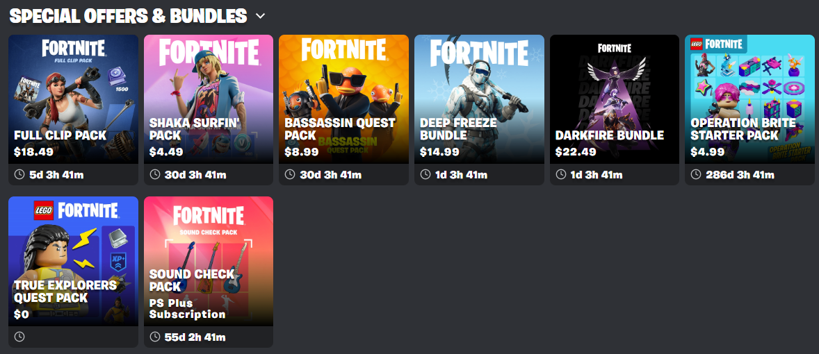 Deep Freeze and Darkfire bundles leave this friday on shop reset, they get replaced by Infinite Drift and Koi Kingdom Packs, for price they're now >$17.25 $17.99As for Full Clip Pack she leaves next tuesday, no way to know for what STW pack returns