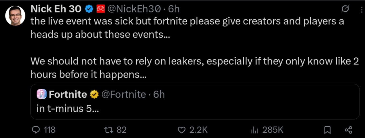 >>558041071>Clix's bright idea was to split ranked rewards into two parts per season, with a ranked reset inbetween and effectively make you grind to unreal in 3 seperate modes twice a season>Probably threw a fit seeing everyone just camping on balloons now they told epic to tweak how you gain rank so it gives less from bush/balloon campingCan't wait to see how many more times they're going to adjust this until they finally throw their hands up and revert it