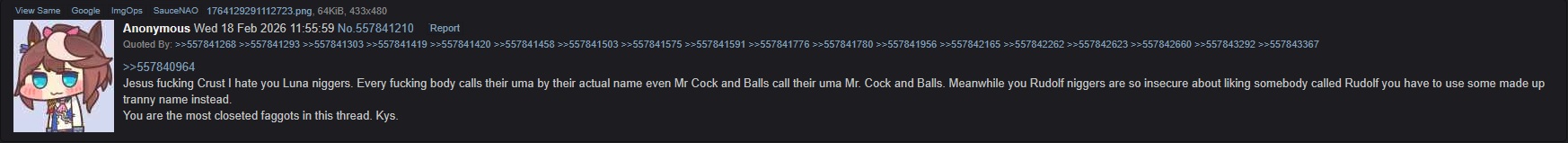 >557971637>reeee dont talk about the media franchise in the thread devoted to it>respond to my offtopic /pol/niggerykill yourself, not even giving you a (you)