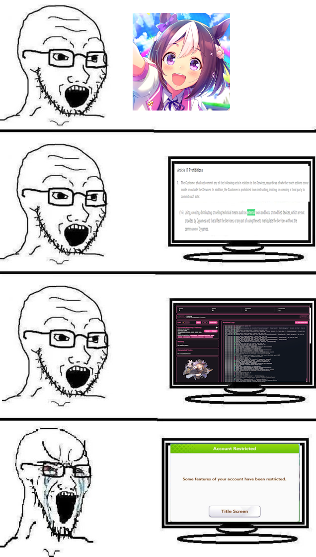 >>557980986>Because everyone has a limited resource, which is timeNot him but exactly this. Which is why I don't even blame botters anymore after experiencing how harsh parent farming can be and how I almost burned out trying to farm a fucking simple 2* mile sparks that I didn't get over 30++++++ times. Heck, if I don't love my account then I am definitely sure that I would be using hachimi and sweepy.