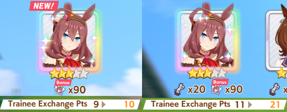>>557983060no, not usually. I got 0 Riko on the free 100 pulls, 0 Riko (SSR and R) on 200 Kitasan pulls, and one (1) R Riko on the Fuku pulls, so I have a lvl 20 R Riko, which is pretty shitty, if I were going to use pal card my mlb Aoi would be better. That's probably weakening my Aoharu runs, since I'm usually borrowing Finemo, especially for short distance tracks like Capricorn and Aquarius. Can't be helped, I guess.