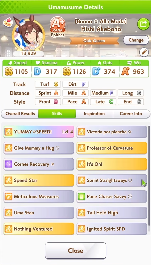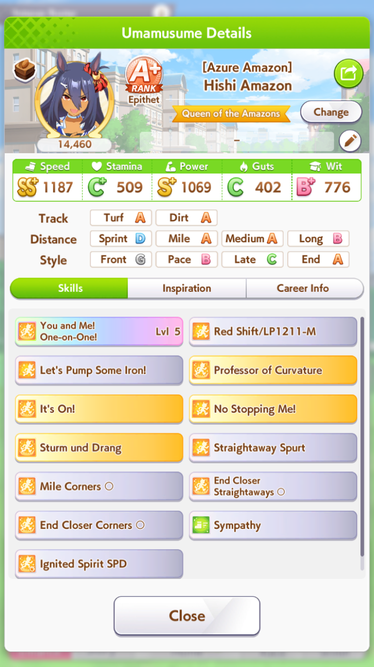 >>557982793That's up to you. Her rank at every distance is good enough that you can make her work with enough sparks.Dirt's the only real pain in the ass because raising someone from G to A needs a ton of sparks on both sides and luck.