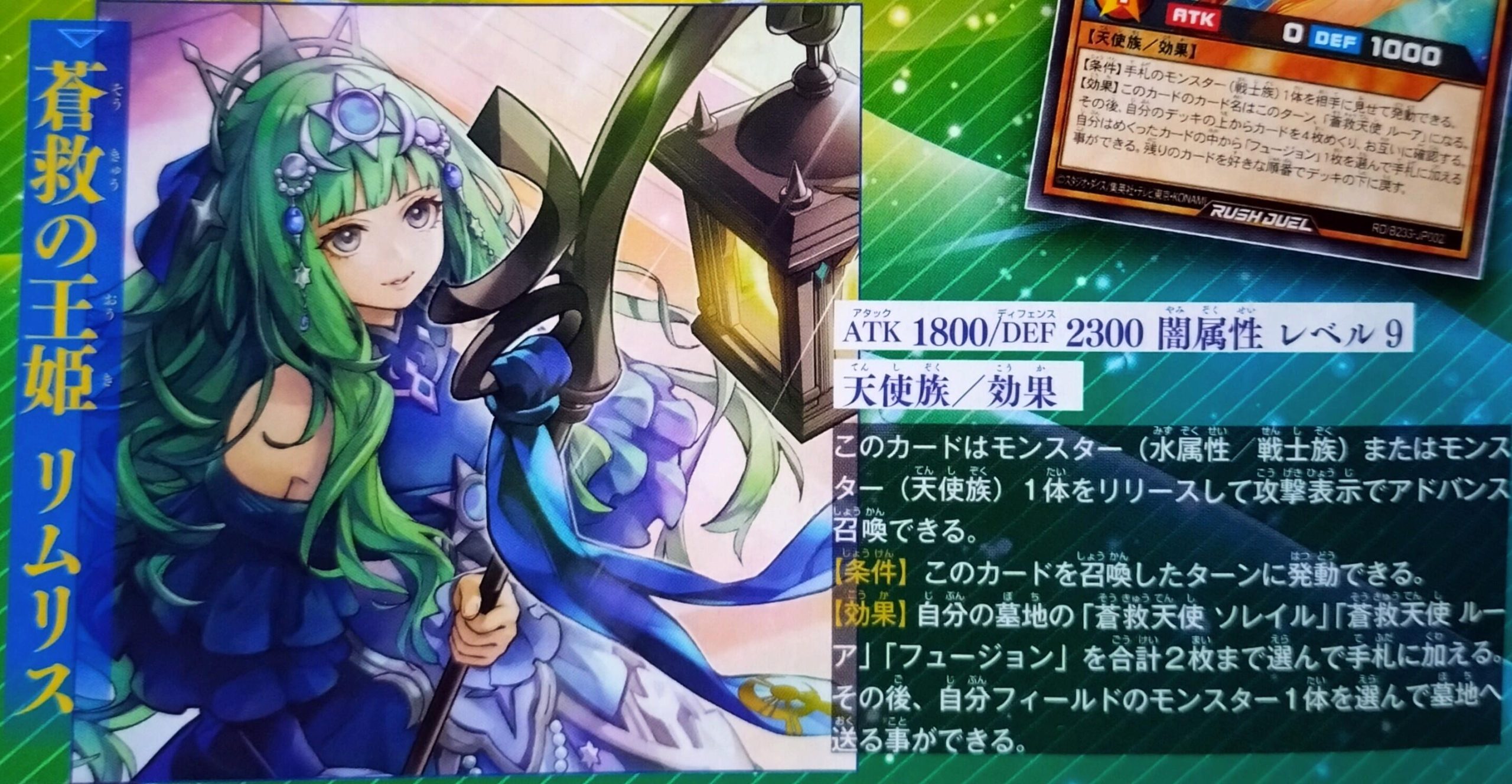 蒼救王姫 リムリス Soukyuu Oh-Hime Limlith (Limlith the Skysavior Princess)Level 9 DARK Fairy Effect MonsterATK 1800DEF 2400You can Tribute Summon this card in Attack Position by Tributing 1 WATER Warior monster or 1 Fairy monster.【REQUIREMENT】 During the turn this card is Normal Summoned.【EFFECT】 Choose up to a total of 2 “Soliel the Skysavior Fairy”, “Lua the Skysavior Fairy”, “Fusion” in your Graveyard and add them to your hand. Then, you can choose 1 monster on your field and send it to the Graveyard.