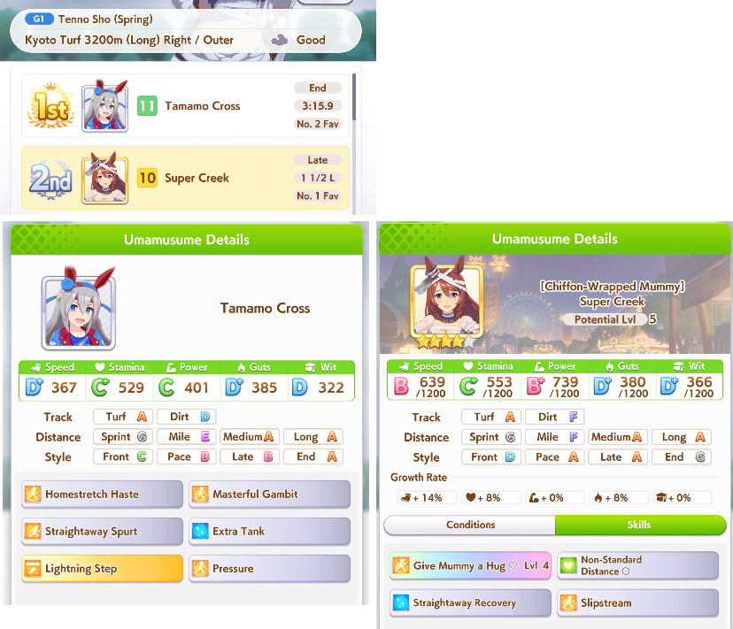 >>558001757The final straight is ~33 meters after late race starts. It isn't that much later.>>558001763Wellllllll I ended up with next to no end closer hints, and spurt is pretty crucial to making it all work. No spurt means your only accel is NSM, which will be spotty due to the final corner fan out.