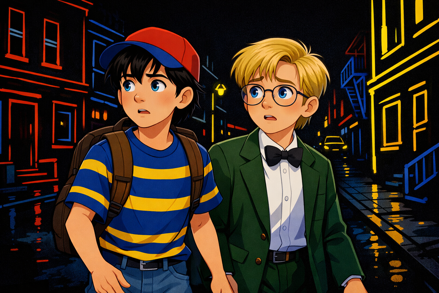 >>558118686A tall man and a short manThe tall man is lanky, blonde, green eyes, pale skinThe short one is buffed, hairy, tannedThe short one is pigging back the tall one