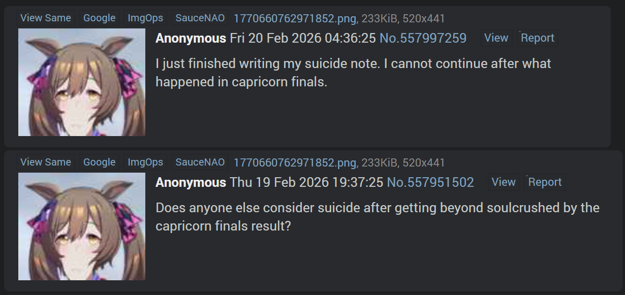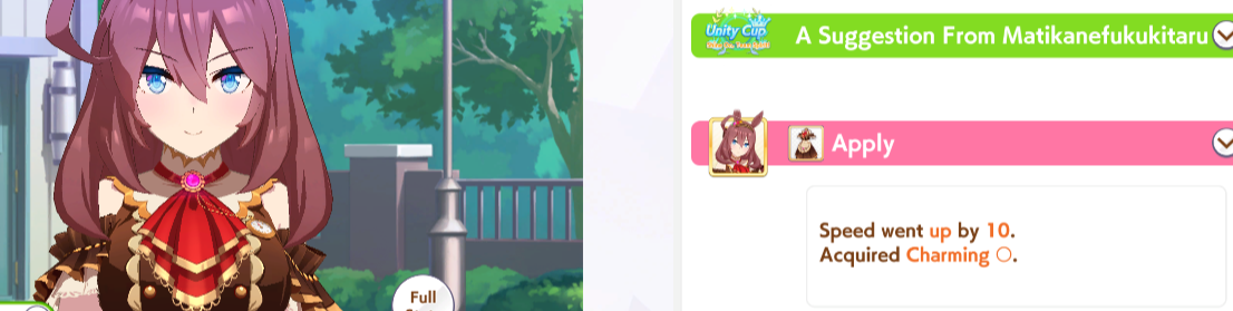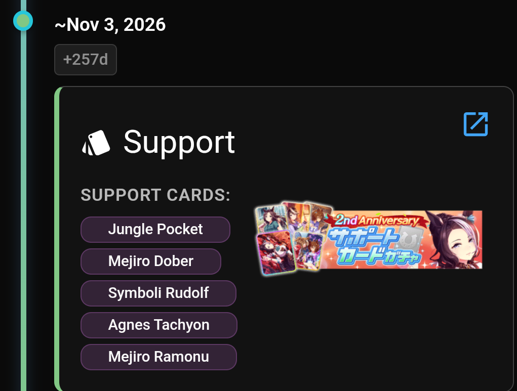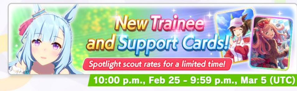 Previous: >>557986763Thank you for always being there for me.>Global Game NewsLink your account to Cygames iDCurrent Scenario: Aoharu Hai aka "Unity Cup"Current Rate Up Trainee: Mihono Bourbon (3* alt), Eishin Flash (3* alt), Sakura Chiyono O (3*)Current Rate Up Support Cards: Nishino Flower (Wit), Sakura Bakushin O (Guts), SSR Riko Kashimoto (Pal), SSR Tazuna Hayakawa (Pal)Current CM: Capricorn Cup - Chukyo Turf 1200mMain Story Chapter 5 is out02/13 - 02/19 - Capricorn Cup - Chukyo Turf 1200mhttps://umamusume.com/news/100040/https://pages.snep.pw/uma/anni-skill-changes/>JP Game NewsCurrent Rate Up: Valentine Taiki Shuttle (3*), Valentine Sounds of Earth (3*), SSR Matikanefukukitaru, SSR Neo UniverseNew Scenario "Yukoma Hot Spring" releasedTimeline: https://uma.moe/timelineCygames Webstore: https://webstore.cygames.com/en/umamusume_en/>Thread Clubshttps://rentry.co/umaglobalclublistYou must be E3 (20k points) to join a circle. Apply with /uma/ or /vg/ in your profile or post ID in the thread.>All Guides & Resourceshttps://rentry.org/uma26Game databasehttps://gametora.com/umamusume (Click the gear to switch between JP / global server info)A basic guide for newfagshttps://rentry.org/umaglobalFind networks if your region is blocked from the game or clienthttps://www.umavpn.top/93Seiyuu & Concertshttps://rentry.org/umstUma Texthttps://umareader.idsmile.xyz/