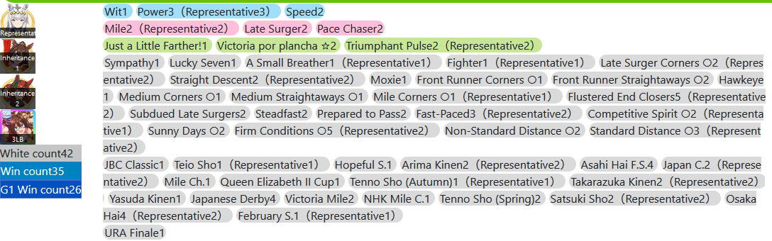 >>5580202462* mile, 12* dirt, double circle affinityBoth parents have stupid amounts of g1/g2/g3 wins and I'm lucky if I get a Dirt A from 5 borrows
