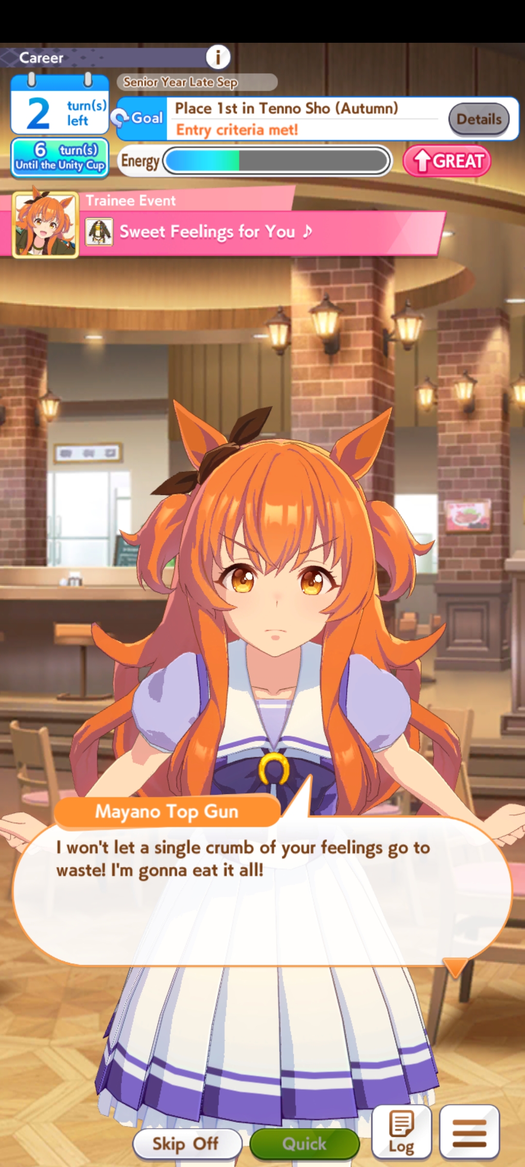 >>558023457>I thought front runners were overall easier on stam than pace chasersYes, but fronts also have spot struggle that eats through her stamina. Valentines Bourbon shouldn't have too much problems though, her ult has a recovery equal to a white. Riko and a couple of bursts on power/stam should do it just fine.