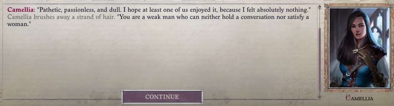 Well that was a wild ride. Don't think I'll ever romance her again (except if I go Lich) but it sure was interesting as for as crpg romances go.