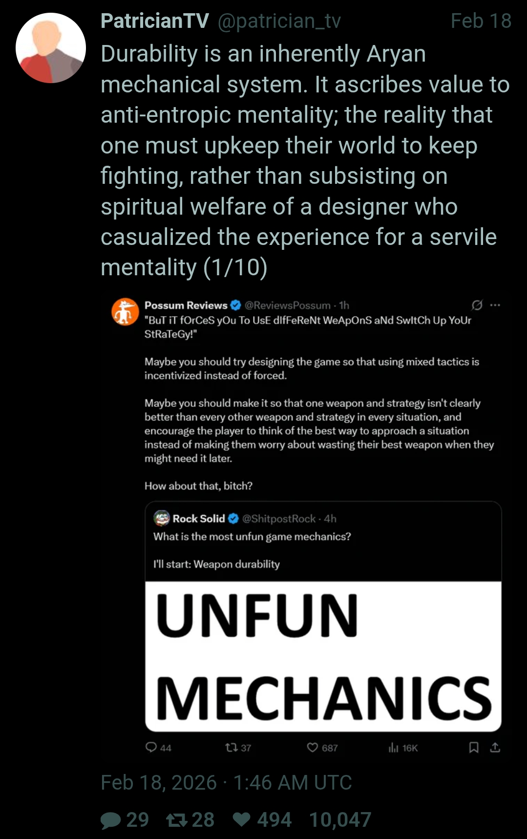>>558092945Durability is a good mechanic that is often implemented poorly. Most people only have experience with it in said poor implementations and as a result believe it to be a bad mechanic.