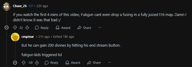 Normalfags take Fubs word as gospel, but I think he's actually extremely underrated in the more knowledgeable parts of the community. It's easy to see his gear upgrades and currency stacks and just think of him as a big juicer and move on, but there's a lot more to it. Last year during merc league I had the coof and was bed bound during league start, so i basically watched his stream for almost 24 hours. Everything this guy does is insanely fast and efficient. The campaign, atlas progression, map clear and looting, crafting, experimenting with new content. He looks at a new mechanic, and within like 20 seconds makes and accurate call about how to correctly engage with it. Also his build and gear choices are always immaculate.