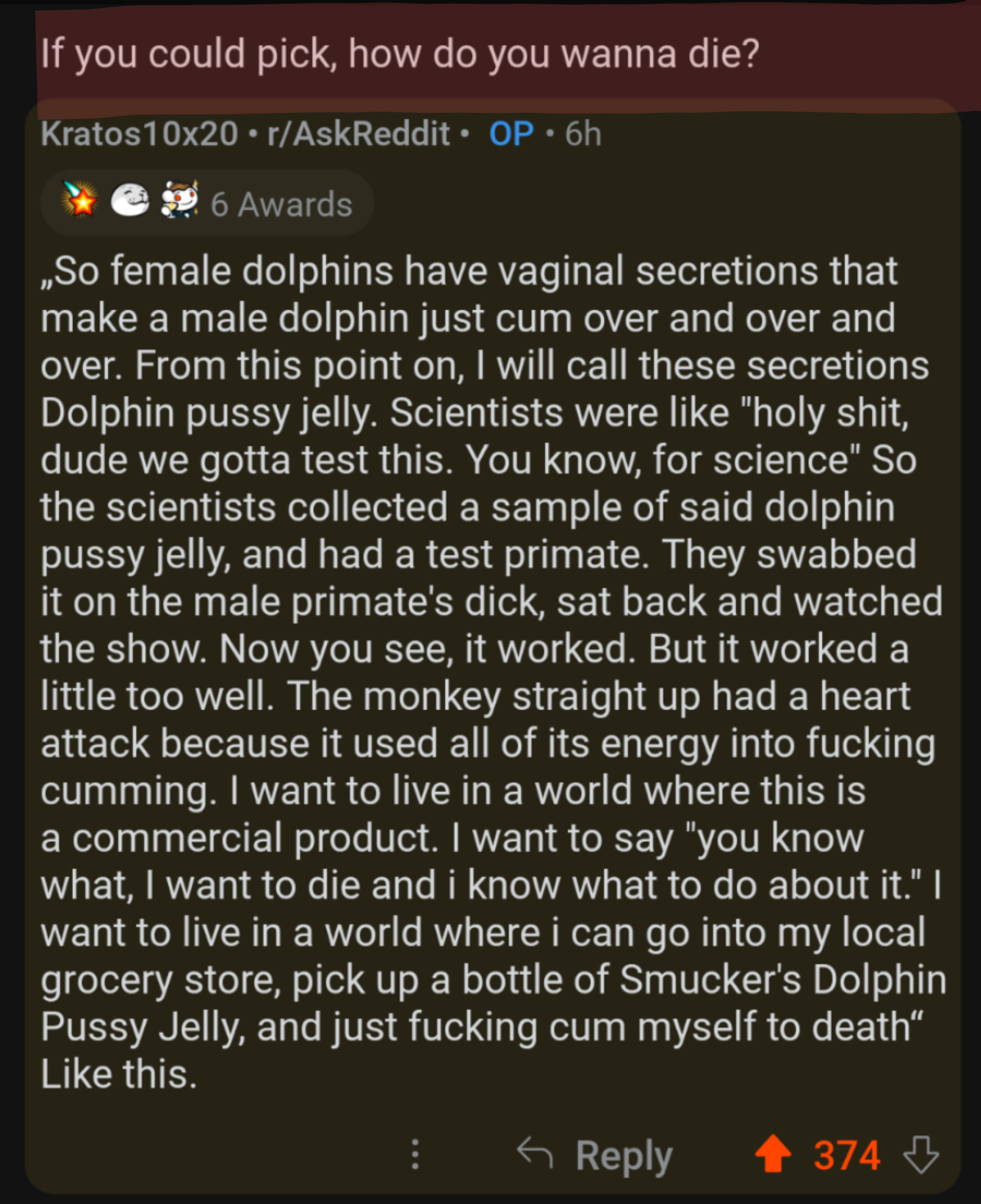 >>558071587Isn't the way that female dolphins play the game by doing crazy vaginal contractions rather than some miracle pussy juice? I don't believe this