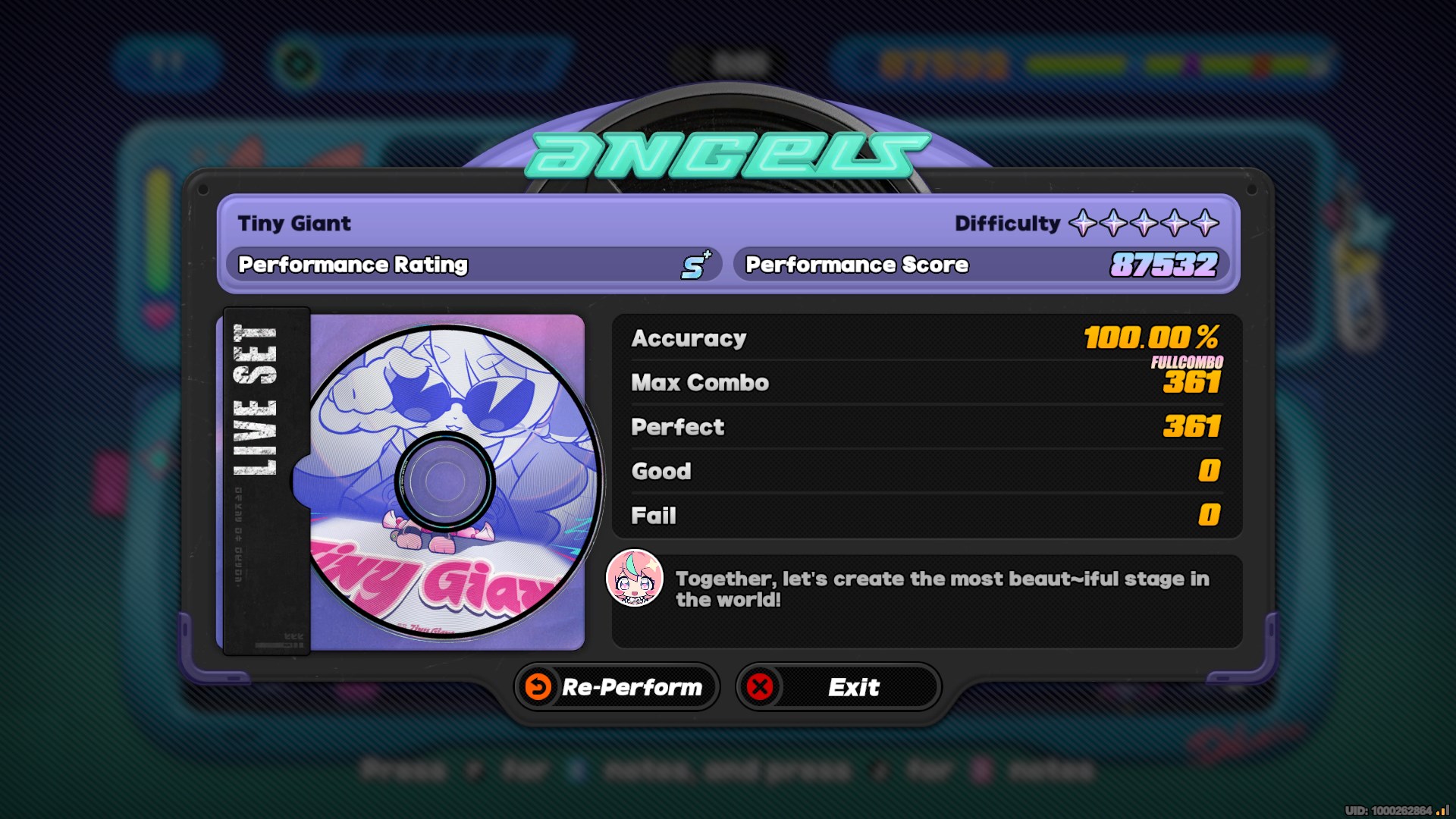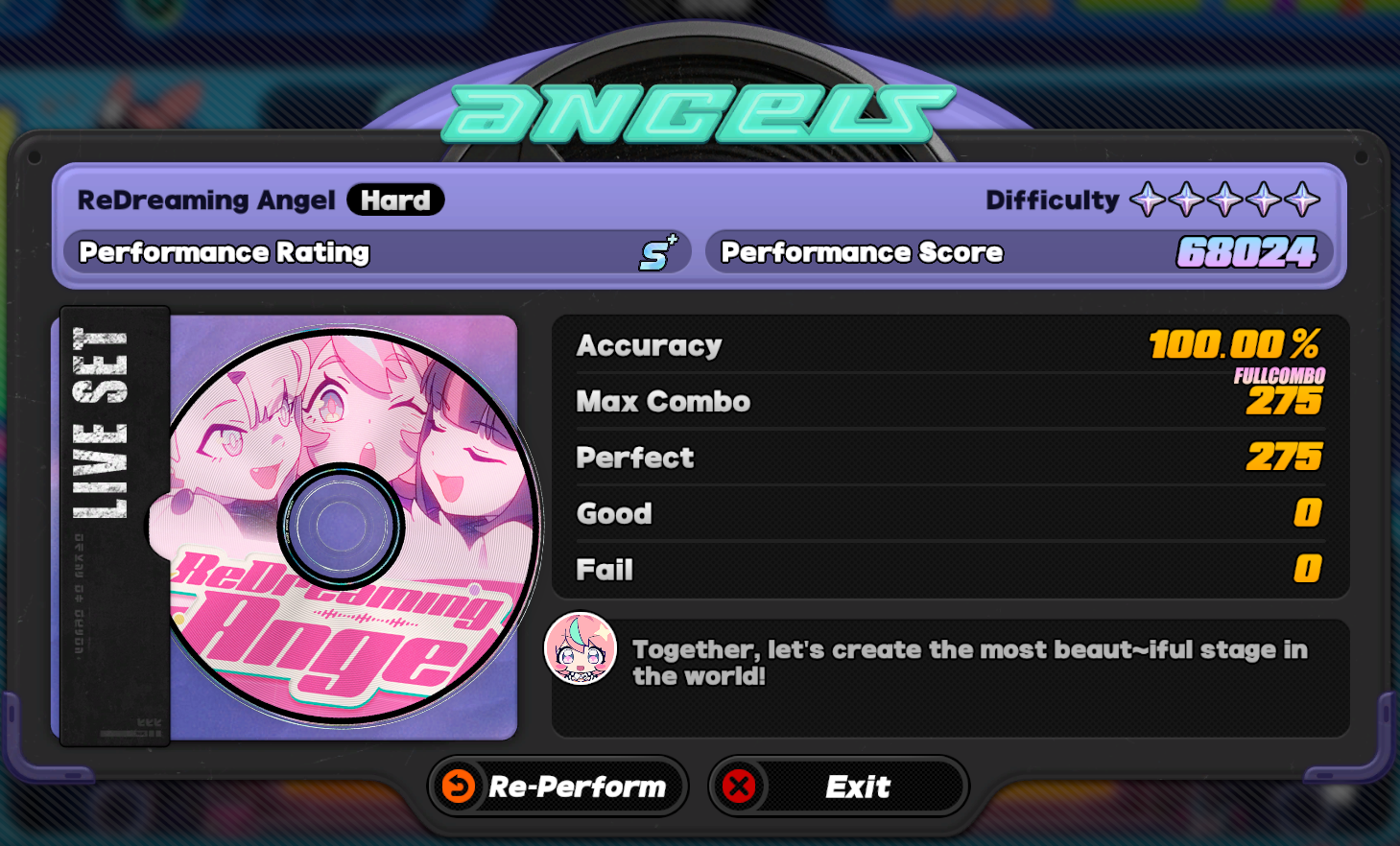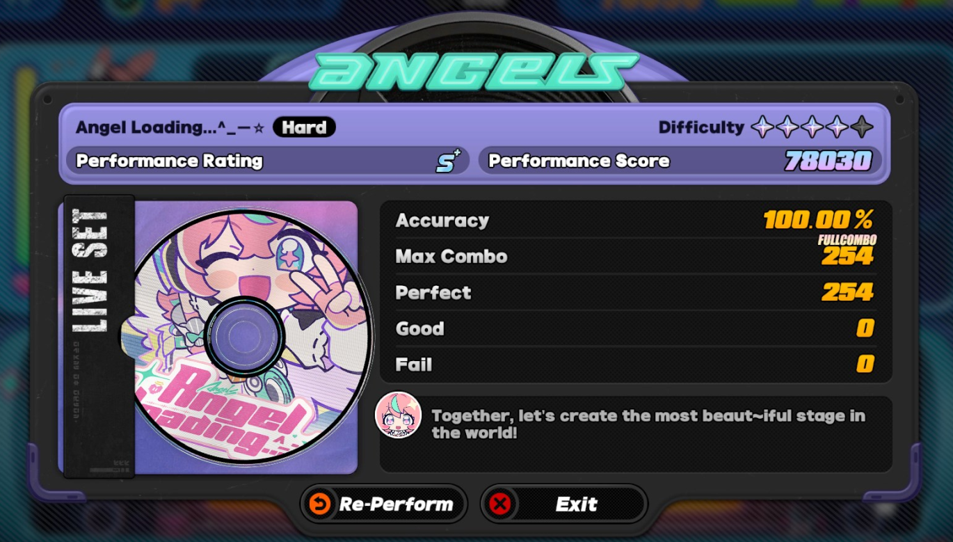 The Angels event really brings me back to both the best and worst parts of trying to FC songs in rythm games...It's fun, it's exciting, it feels rewarding when you finally get everything down, but also sometimes a song has a really slow start that makes retries boring, or the only part you mess up is in the latter half, or the song just fucking SUCKS MONKEY BALLS and you just have to force yourself to listen to it a bunch of times anyways (fuck you Senior Foof your song is SHIT).