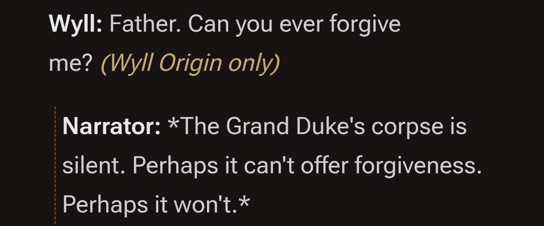 >>558172278>muh daddy :'(man wyll's quest was so fucking ass making wyll a ravengarde instead of a regular rich noble with political clout like the EA was such a bad idea
