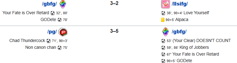 Previous: >>557795785>What... is this?Put simply, a simulation of Pro Evolution Soccer being competed between teams which are embodiments of boards of the 4chan imageboard. The players represent facets of each board's culture. All of the matches are AI versus AI. However, humans "manage" each team, creating their tactics and giving input during games as they happen to make substitutions and tactical changes as they see fit.https://implyingrigged.info/wiki/FAQ>Where can I watch the cup?https://isthisliv.com/4cc/stream.html>Ongoing Invitationalshttps://implyingrigged.info/wiki/VGL_Luigi_Circuit_4https://implyingrigged.info/wiki/LAN_Party_the_3rd:_Admins_of_the_Frozen_Throne>Upcoming Invitationalshttps://implyingrigged.info/wiki/VGL_Ladies_Night_3:_The_Squidstein_Fileshttps://implyingrigged.info/wiki/Test_Cup_V_18.1https://implyingrigged.info/wiki/2026_4CC_Champions_Leaguehttps://implyingrigged.info/wiki//ag/_League_9/11:_Never_Forget>Wiki:https://implyingrigged.info/wiki/Main_Page>Sekkrit Code37pebis>DLC Passworddivegrass>Booruhttps://isthisliv.com/booru/>Archivehttps://implying.fun/>Other videoshttps://implyingrigged.info/wiki/Videos>PES Infohttps://implyingrigged.info/wiki/Pro_Evolution_Soccer_2015https://implyingrigged.info/wiki/Pro_Evolution_Soccer_2021>PreviouslyWeegee week 2 in like 17 hours/1992/Patching autismShitposting