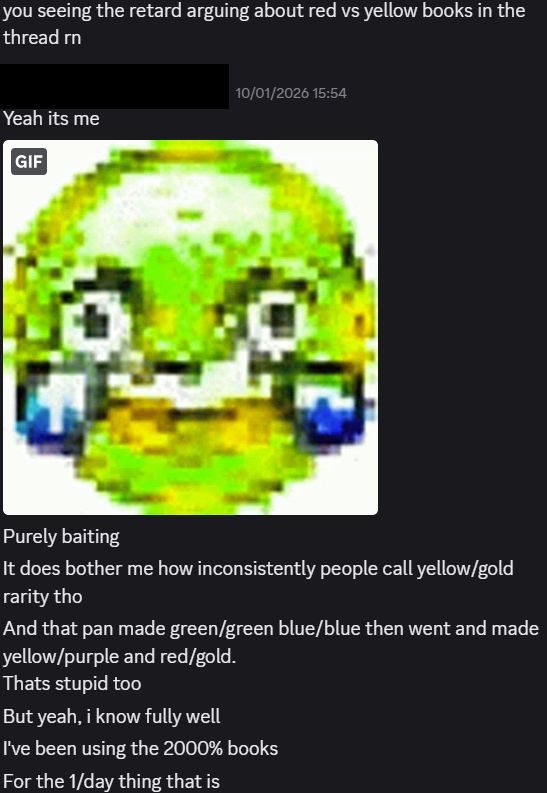 Fucking hell niggers.I posted the first bait about yellow/red manuals.Yes, it was bait. I tried to push it like it wasn't but of course i knew which one people meant and i didn't actually waste any manuals.I didn't try using the same bait, this wasn't discussed again and i was even a bit letdown that the bait didn't go further than 1-2 jokes in the start of the next thread.I don't know and i HOPE these(this?) niggas are baiting because despite being a silly idea to mismatch the colors, it's fairly obvious that people reference 2000% manuals when they say that's the one you're supposed to use. So if you actually mistook them, you're retarded; and this is coming from the original idiot who tried to bait with this.Having that said, imagine falling for the same bait twice and posting such annoyed assmad replies.You're just as bad as the new baiters.>>558145272>the dogshit red manual bait gets rerunAt least this guy was aware i guessNow can you fags stop bringing up AND replying to old failed bait?