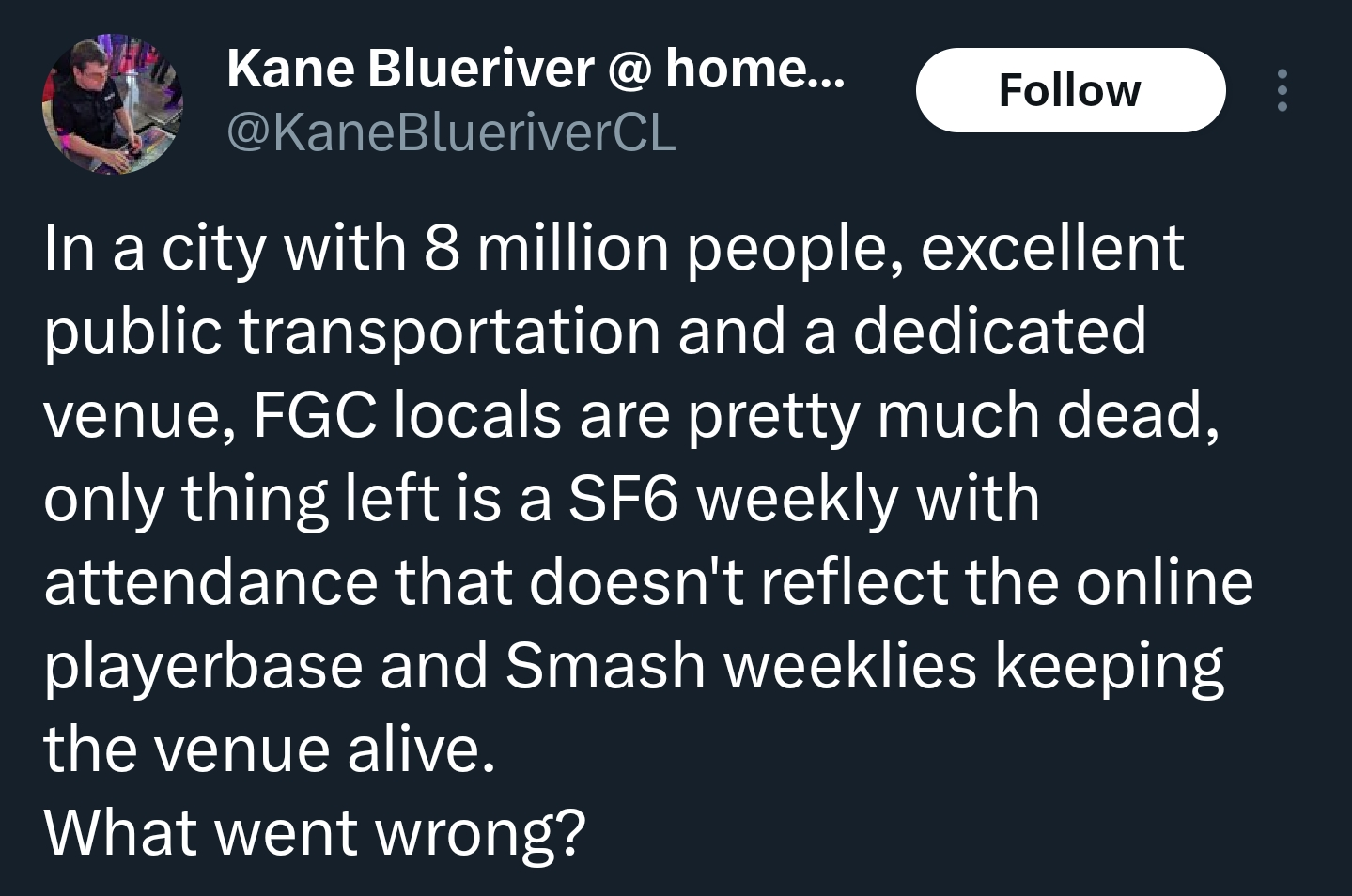 >>558167143>What went wrongSmash has garbage online but nintendofags have no standards and instead of dropping the game, like the FGC does to any game with shitty online like pre-Rising Granblue, they go to locals. They're stuck in the last century. SF6's attendance doesn't reflect the game's popularity like he says because only retards would meet in person to play a game that last I checked had less input lag in PC online lobbies than locally on consoles. But that was on launch, maybe it's better now.>>558167942>Your orange boyfriend BRUTALLY RAPED the economy.The Chilean economy? That's a Chilean player. Or is he living in the USA now?