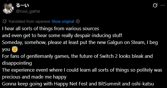 [Sad News]https://x.com/ruui_game/status/2025189166645203312According to somebody who attended a Kingdom's Return demo event and spoke with Inti staff, the possibility of Gal*Gun and other such gentlemen's games on Switch 2 is bleak and apparently even Steam might be more viable now.