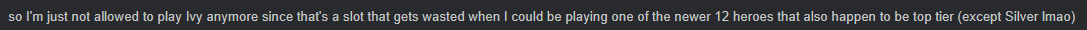 so I'm just not allowed to play Ivy anymore since that's a slot that gets wasted when I could be playing one of the newer 12 heroes that also happen to be top tier (except Silver lmao)