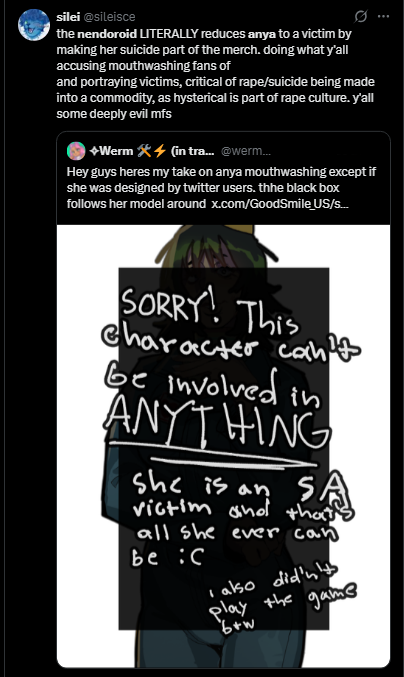 >>558244098>why do some genuinely act like they know the character better than the person who fucking created themthis is the exact same question I keep asking about mouthwashing fans over anya just for being "le sad rape victim" after the nendoroid annoucementlike, dude, she's a fictional character, why do you gotta to be so butthurt about this?