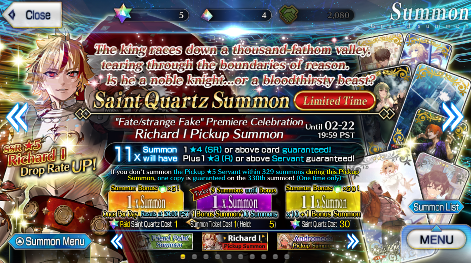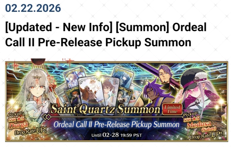 Previous: >>558074720>[New Info] "Ordeal Call II" Release Announced!Release Planned for:Mid-March 2026https://webview.fate-go.us/2026/0217_new_chapter_oc2/>[Campaign] Ordeal Call II Pre-Release Campaignhttps://webview.fate-go.us/2026/0215_pre_oc2_cp/2026-02-17 20:00 PST (GMT -8) - 03-20 20:59 PDT (GMT -7)>[Summon] Ordeal Call II Pre-Release Pickup Summonhttps://webview.fate-go.us/2026/0215_pre_oc2_pu/2026-02-17 20:00 - 02-28 19:59 PST (GMT -8)>[Summon] Valentine's 2026 Free Quest Backup Kyokutei Bakin Pickup Summonhttps://webview.fate-go.us/2026/0212_valentine_2026_qbpu/2026-02-12 20:00 - 02-24 19:59 PST>[Summon] "Fate/strange Fake" Premiere Celebration Richard I Pickup Summonhttps://webview.fate-go.us/2026/0204_sf_pu2/2026-02-06 20:00 - 03-01 19:59 PST>[Event] Valentine's 2026 - Beyond the River of Chocolatehttps://webview.fate-go.us/2026/0127_valentine_2026/2026-02-04 00:00 - 02-24 19:59 PST>[Summon] Valentine's 2026 Pickup Summonhttps://webview.fate-go.us/2026/0203_valentine_2026_pu/2026-02-04 00:00 - 02-24 19:59 PST>[News]https://webview.fate-go.us/>[Servant Info]Servant Material Lookup: https://fgosim.github.io/Material/Servant Planner: https://github.com/chaldea-center/chaldeaCoin Calculator: https://fgo-servant-coins.glitch.me/index.htmlRank Up + Interlude Timeline: https://kazemai.github.io/fgo-vz/relate_quest.htmlRate Up Tracker: https://tohnocoding.github.io/fgobanners/>[Mats/Summoning Info]Rateups in FGO JP: https://files.catbox.moe/lf1qmz.pngQuartz for next Summer: https://docs.google.com/spreadsheets/d/1iRH60QpLNvHy9MMDKLJGNSg4s7FsDfdXtJtOUVDj5po/edit?gid=162156045#gid=162156045FGO Event Compendium: https://docs.google.com/spreadsheets/d/1qvxLU407QwiFaCvItqR16SqqAVlLD5u5nBzY_bCFYvs/edit#gid=2111060397Drop Rates: https://docs.google.com/spreadsheets/d/1_SlTjrVRTgHgfS7sRqx4CeJMqlz687HdSlYqiW-JvQAFGO Raw Database: https://apps.atlasacademy.io/>[FAQ]https://rentry.org/alter-faq