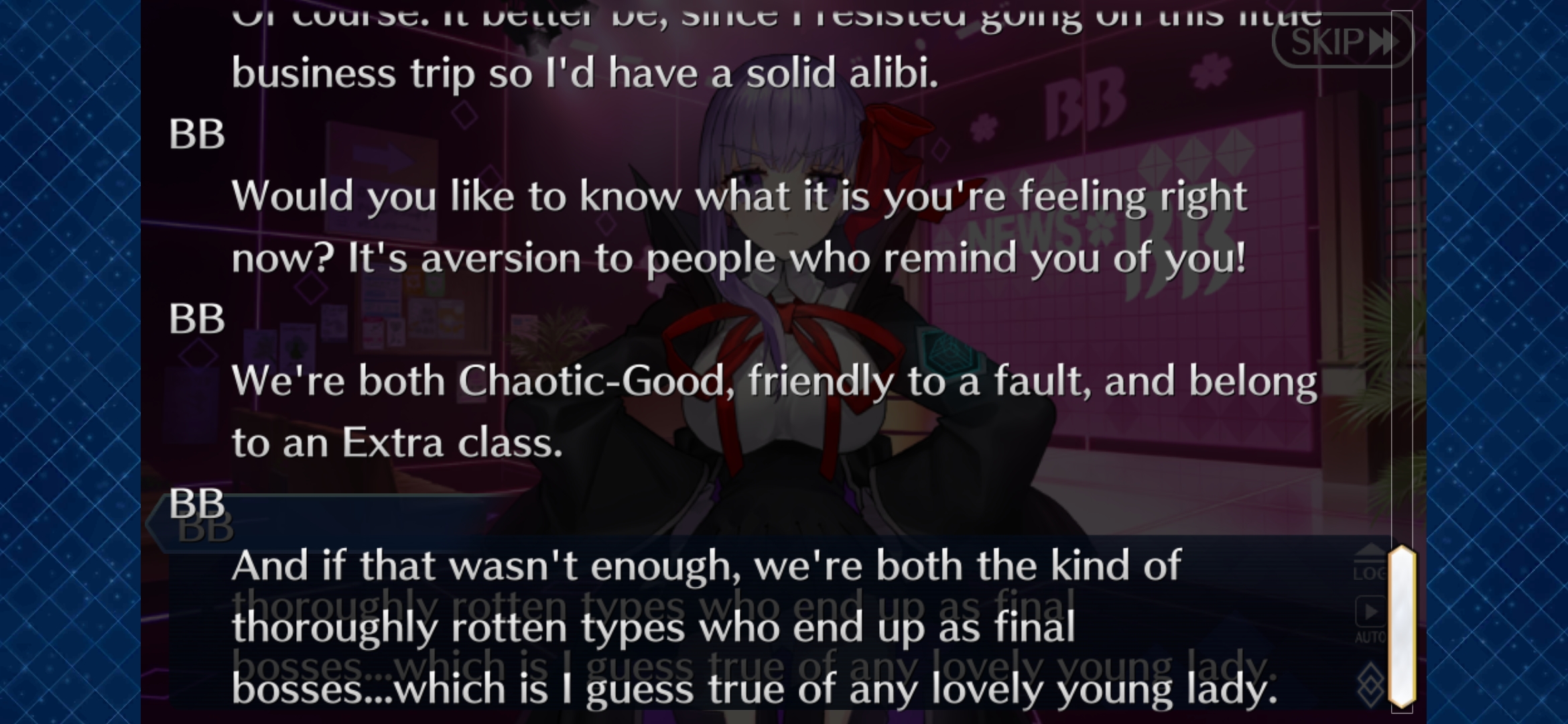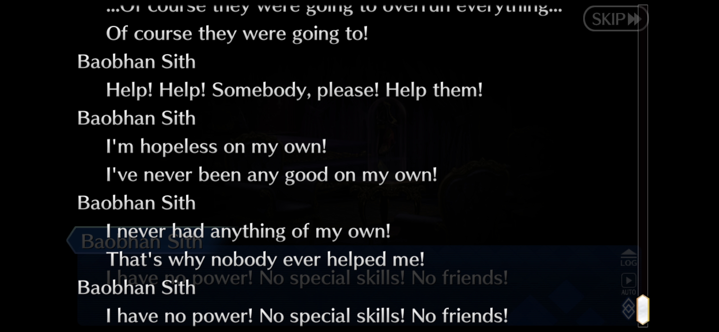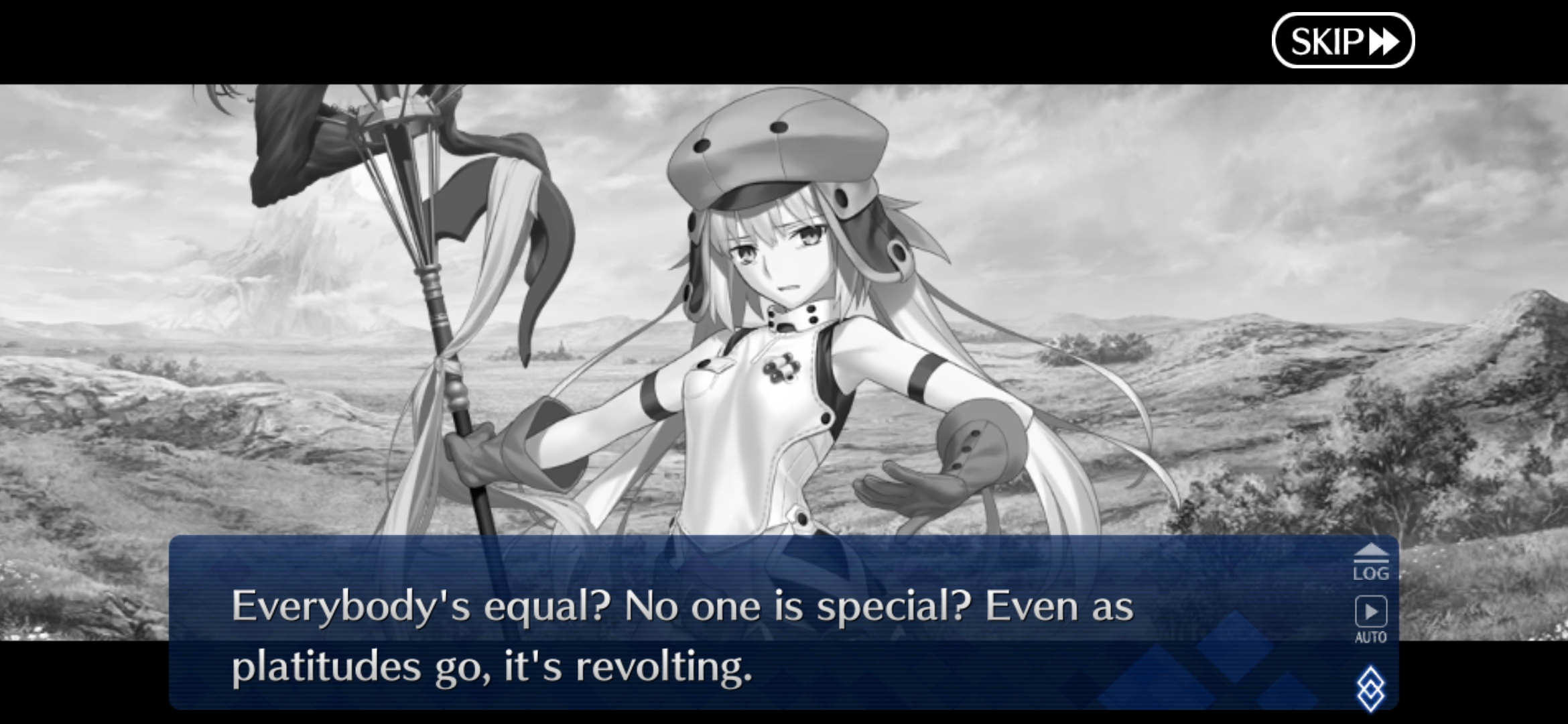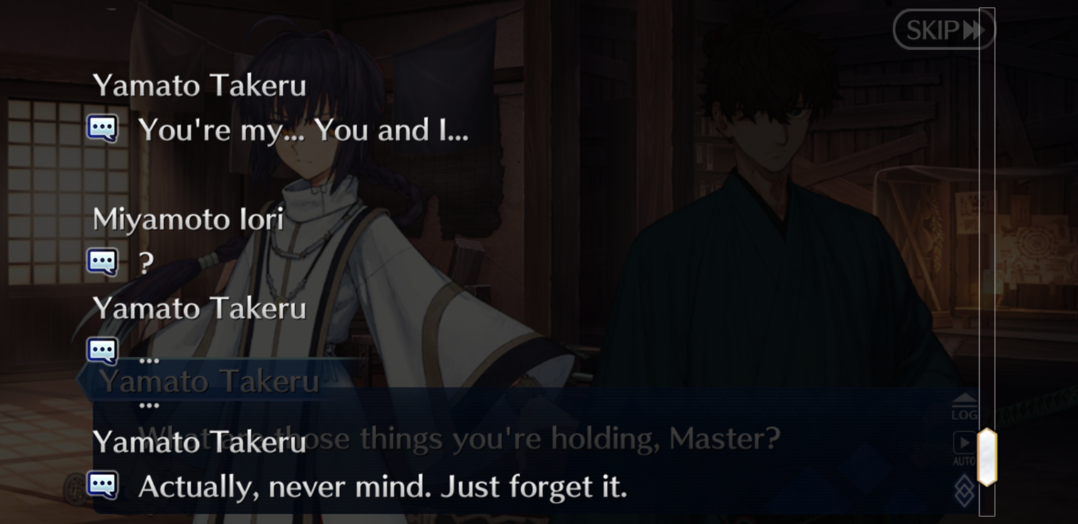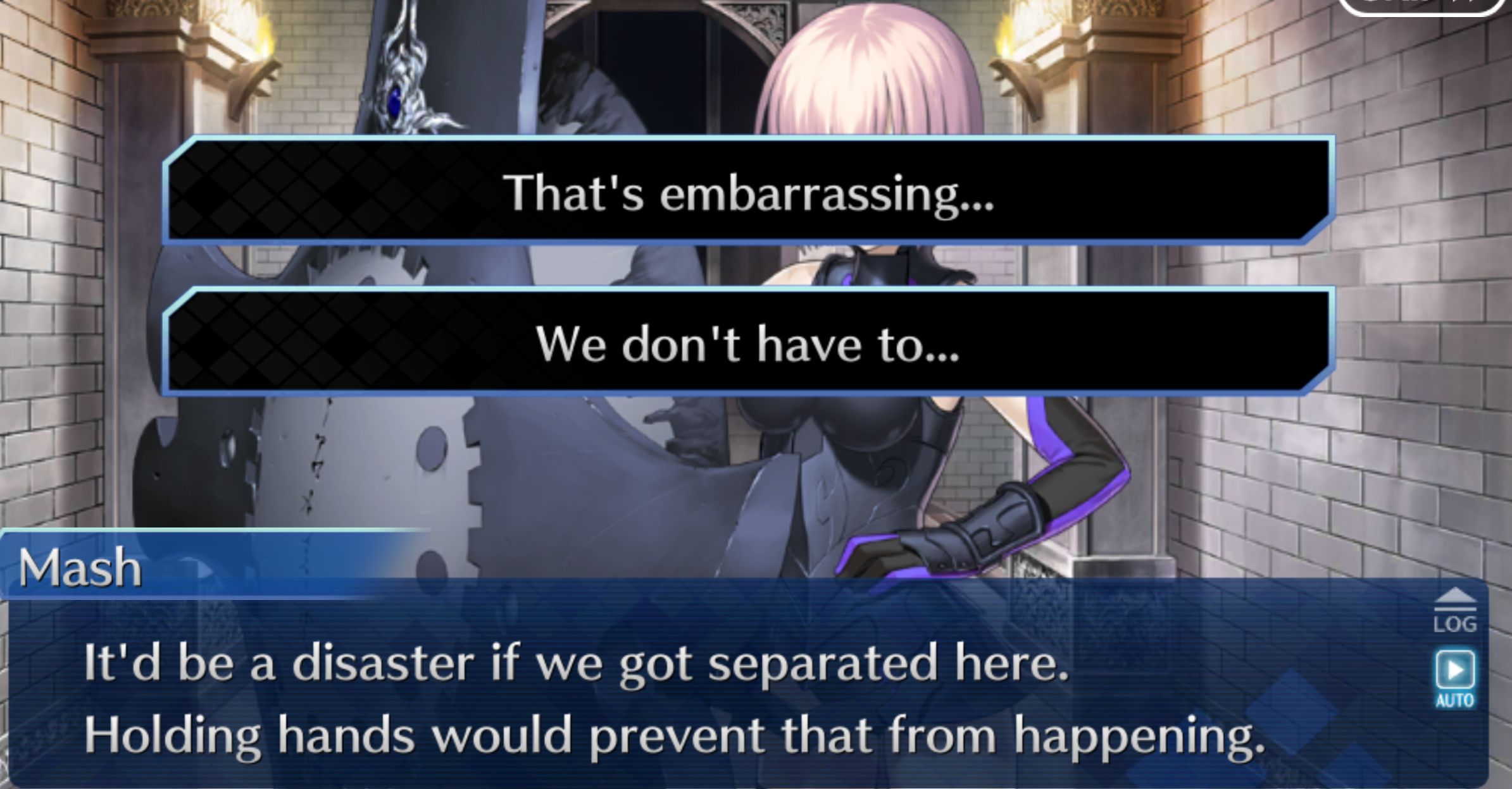 >"What's that?">Repeats everything (you) said to convey to the player what Fujimaru is sayingHoly shit this is the most annoying thing about this game, bar none. Just the laziest writing crutch possible for a first person perspective VN. Just pop up the text option for us to press instead of making characters seem like they're retarded and have to repeat everything they here us say.