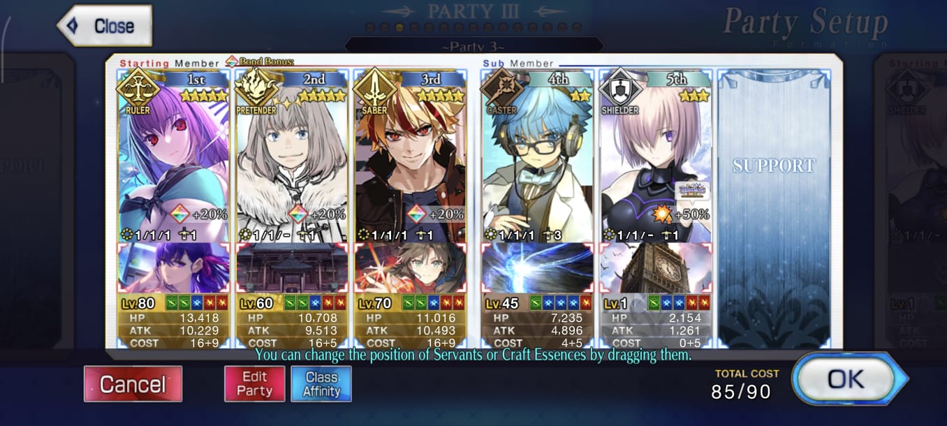 >>558341297You are better off focusing on one servant at a time until you have decent class coverage, but you can probably get carried pretty far with a random support servant. Taking the time to do some ember nodes to get your SR/SSR up to 80/90 if you have the materials for them wouldn't be a terrible plan. Also don't get hung up on the classes for embers. It barely matters