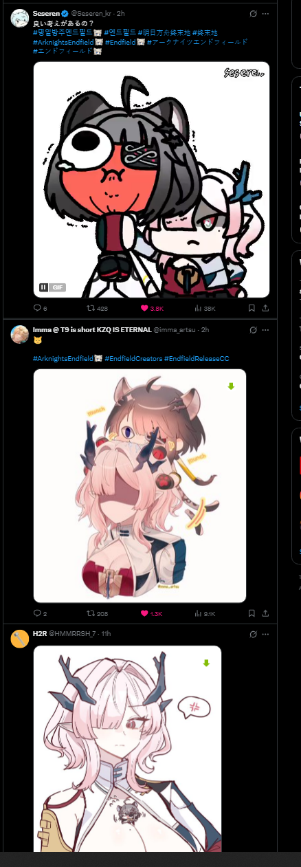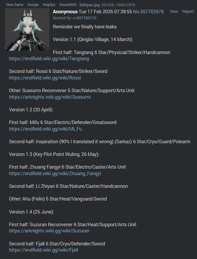 Previous thread: >>558214658>Official Websitehttps://endfield.gryphline.com/en-us>Official EN X (News)https://x.com/AKEndfield>DEV Comm (Developer Updates)https://endfield.gryphline.com/en-us/news/3846>Gilberta PV'shttps://www.youtube.com/watch?v=8hZVxeiSmQ4 - EP [Snap Shot]https://www.youtube.com/watch?v=BQom1V9TdbM - Operator Storyhttps://www.youtube.com/watch?v=h70w5ZmXLkE - Combat Demo>Chartered Headhunting ScheduleFebruary 7th to February 24th --- "The Floaty Messenger", (Gilberta)February 24th to March 13th --- "Hues of Passion", (Yvonne)TBA>Reward CodesENDFIELDGIFTENDFIELD4PC>Twitch Dropshttps://endfield.gryphline.com/special/third-party-binding?channel=twitch>Voyage to the Stars (Ongoing until March 4th)https://endfield.gryphline.com/activity/voyage-to-the-stars/en-us/>Wikishttps://wiki.skport.com/endfield (Official)https://perlica.moehttps://warfarin.wiki/enhttps://endfield.wiki.gg/>Blueprint Guideshttps://talospioneers.com/en>Stickershttps://drive.google.com/drive/folders/13KH3L6QPIKkVH7pBddv4uxwmwJsnOtklhttps://drive.google.com/drive/folders/1OuVtjv1k-9c3M6n7d4PX3CGG5bkwH04ahttps://drive.google.com/drive/folders/1AStB8bzFk3lSwMwczWPkFYCBrZe0vHOghttps://drive.google.com/drive/folders/1yS0lqUhxf8tBRtpDFfCU1y16IS2sSeF7>Fr/end/sSubmit your info, /end/min:https://forms.gle/Fo7BhZMKaKqiWyL19View other /end/mins:https://docs.google.com/spreadsheets/d/1YtxiDss0hgEQhLlZgpfzyGrJrzUcqDzOS9T6IH-BiVc/edit?usp=sharing